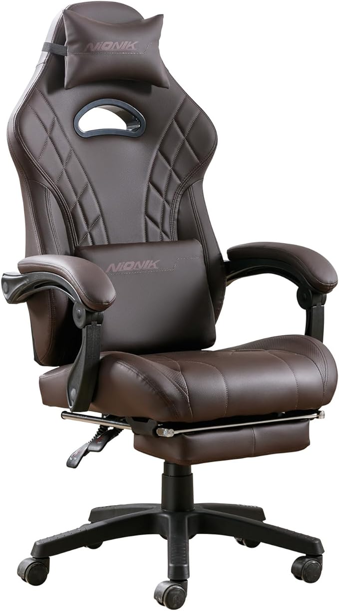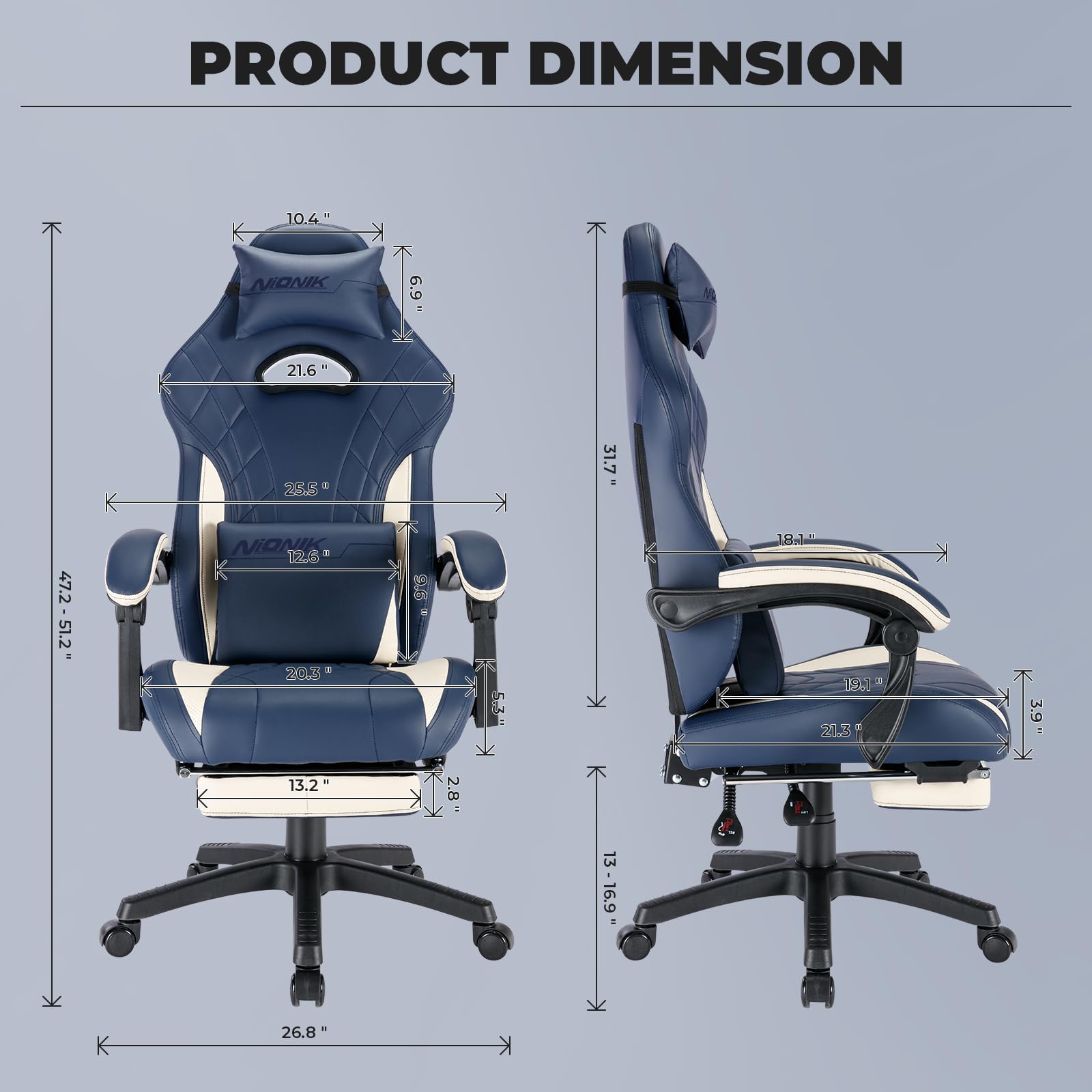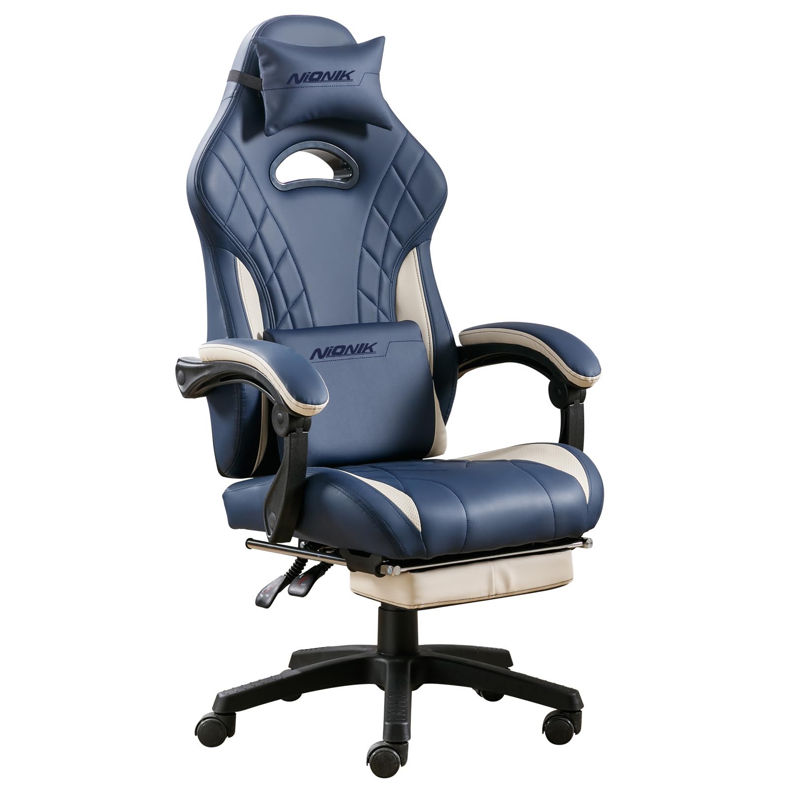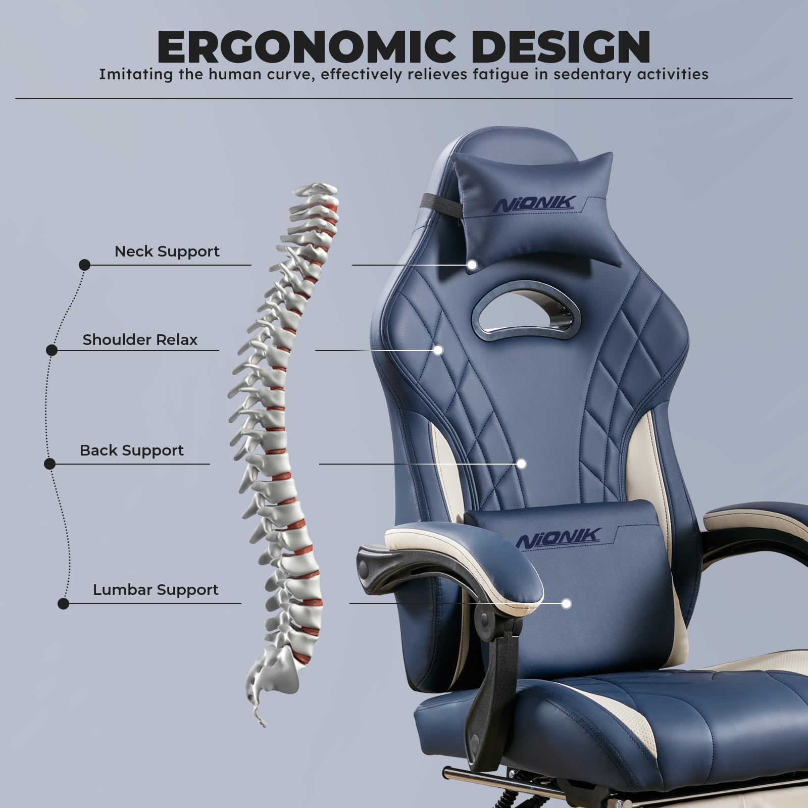 - High Comfort Gaming Chair The gamer chair comes with an adjustable headrest and a massage lumbar support. When your neck and waist are sore from sitting for too long, a head pillow and a massage lumbar support can relieve your fatigue. In addition, this gaming chair cushion, backrest and armrest are filled with high-density high elastic setting cotton with a soft leather cover that has the same elasticity and comfort as a sofa. Sitting on it will give you the most relaxation.