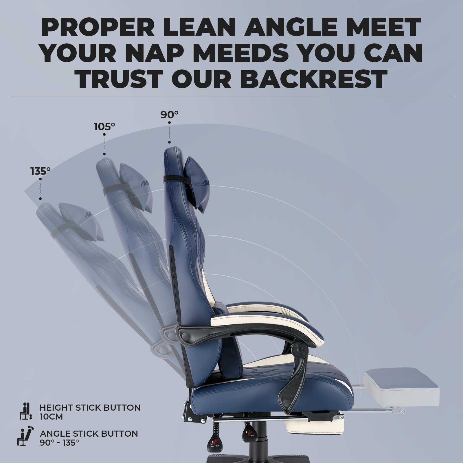- Multi-Function Adjustable Gamer Chair This game chair has a 90°-135° tilt function. The gaming chair can also be used in combination with a pull-out footstool, suitable for playing, working and reading or napping. The office game chair features an adjustable seat height, highly flexible headrest and lumbar support. A high level of maneuverability with 360-degree rotation and ultra-smooth caster support allows you to move noise-free with ease.