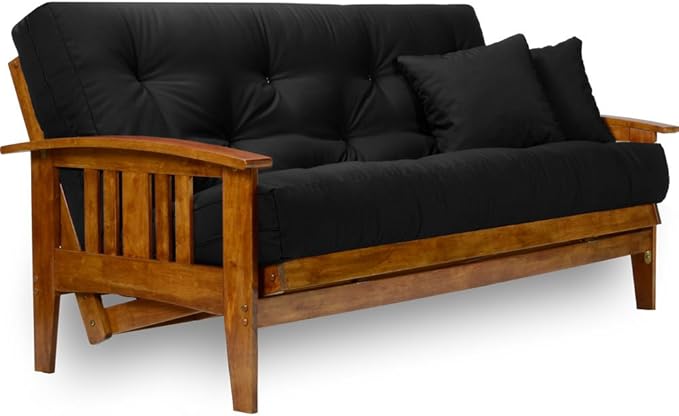 - 100% solid hardwood futon frame for durability with finished seat and back decks