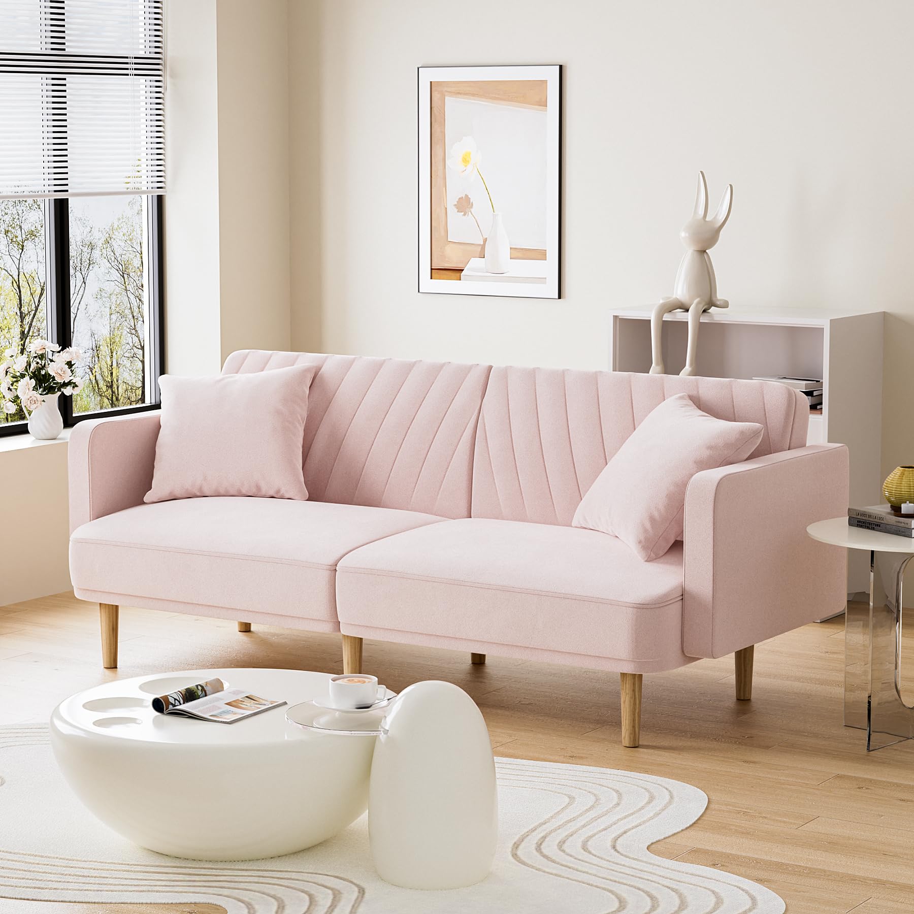 Futon Sofa Bed, Small Couch Mid Century Modern Loveseat with 2 Pillows, 75" W Convertible Futon
