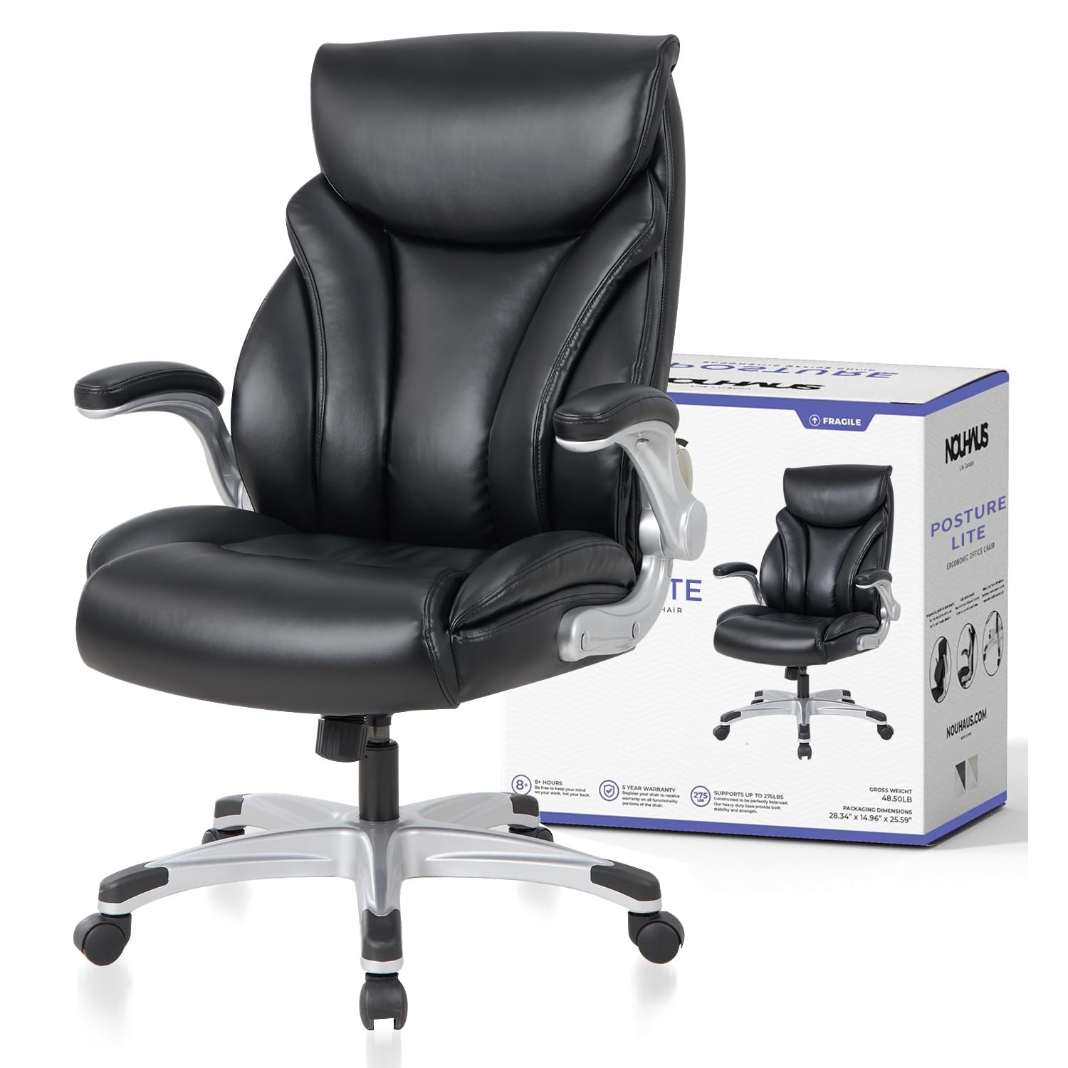 Office Chair with Lumbar Support, High Back PU Leather Ergonomic Office Chair, Executive Desk Chair Computer Chairs with Adjustable Flip-up Armrests (Posture Lite,Black)