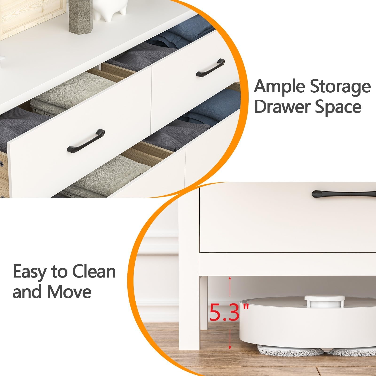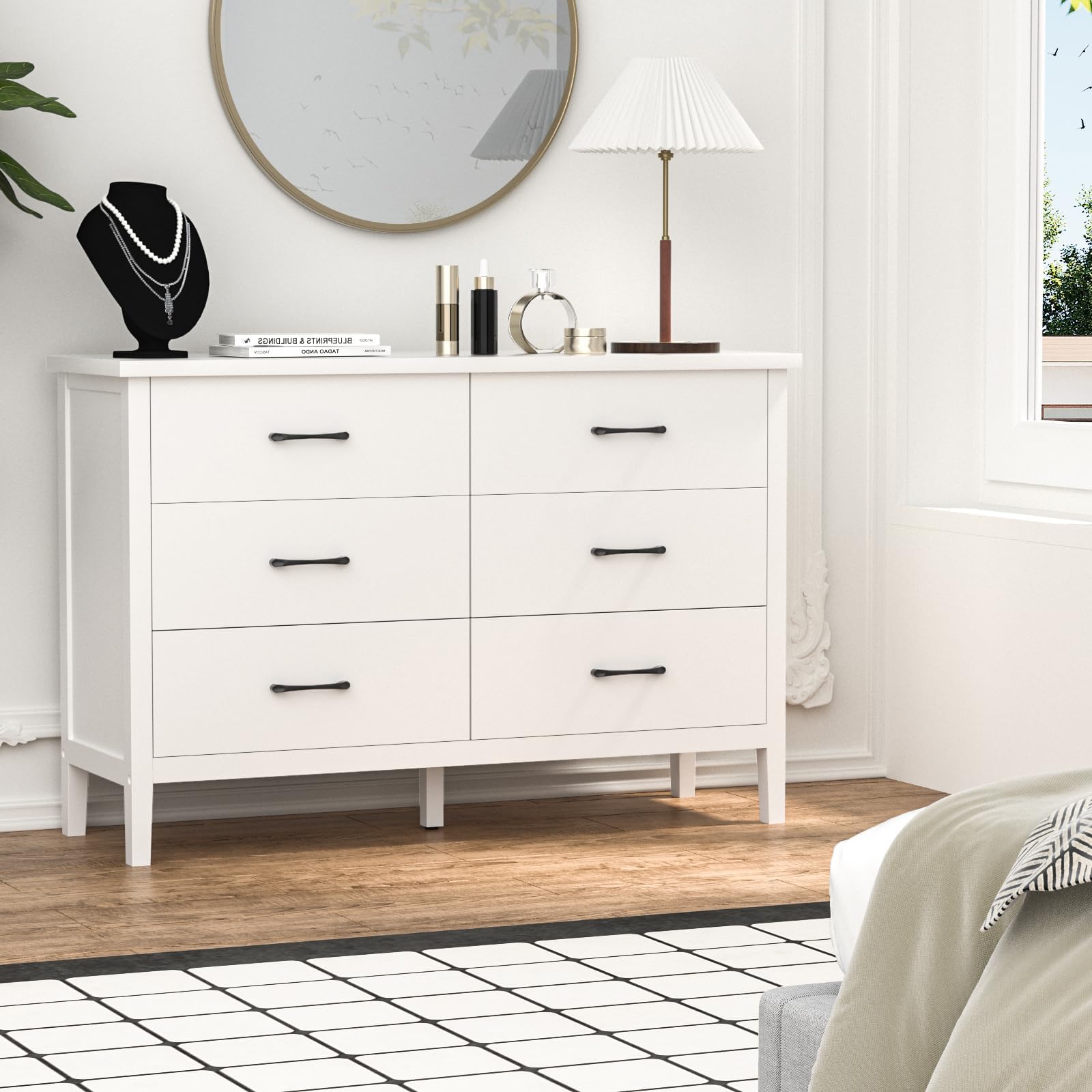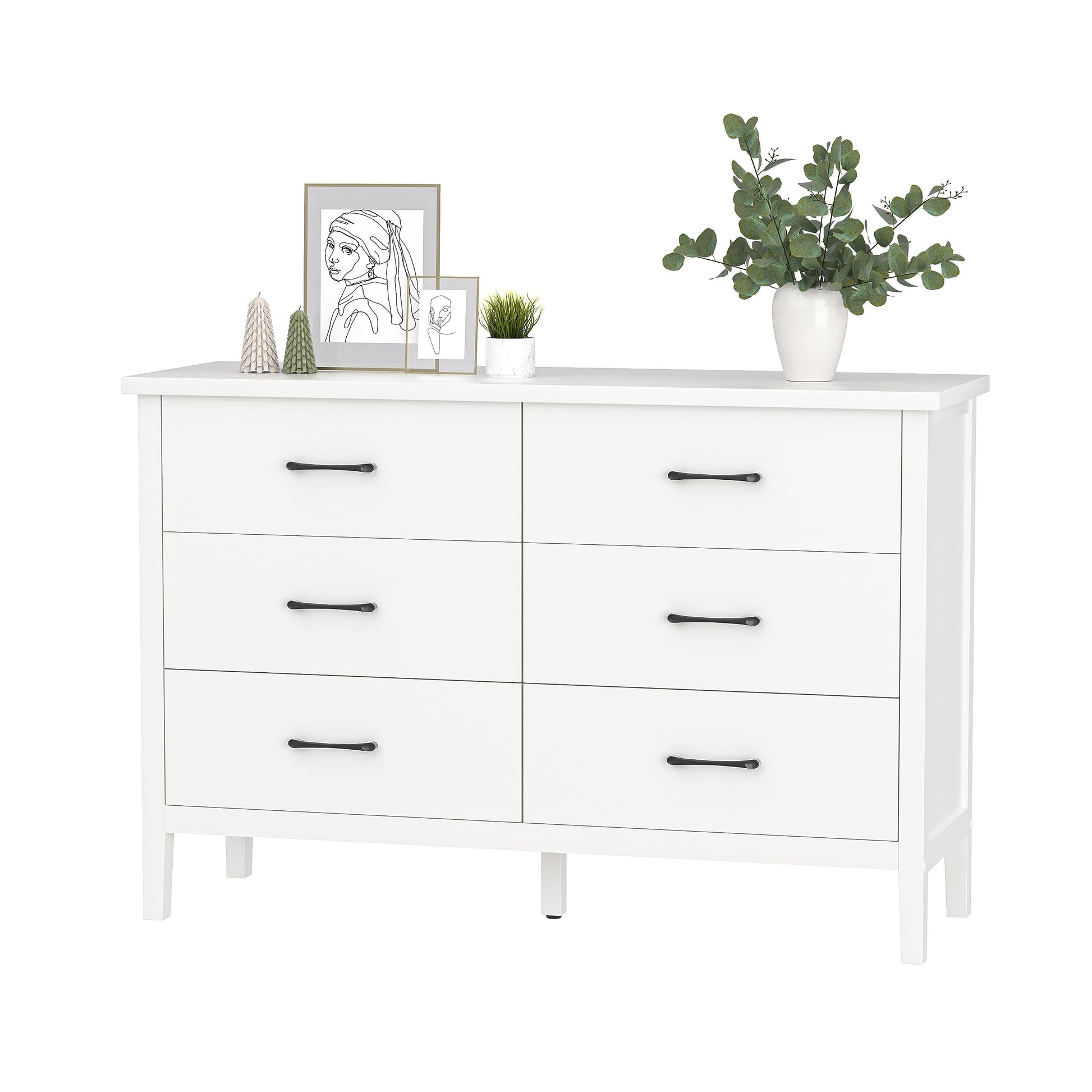 - Ample Storage Space: Come with 6 deep and wide drawers, keep your folded T-shirts, pants, and extra linens in the 6 spacious drawers and display photos and decorations on the large top surface. This white dresser provides ample storage for all your clothing and accessories! Each drawer can be opened up to 4/5, which is convenient for opening and utilizing all of the space. Let's organize your belongings, freeing up closet space and reducing clutter in your bedroom!