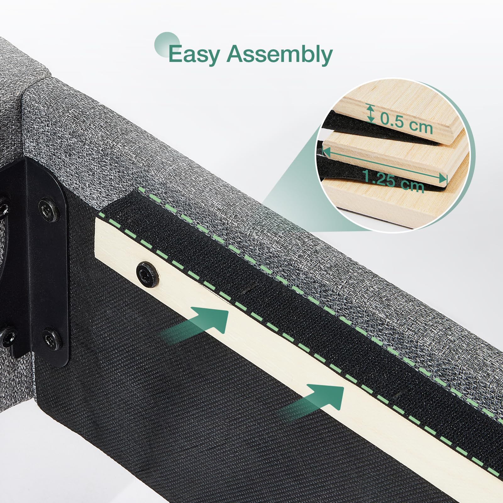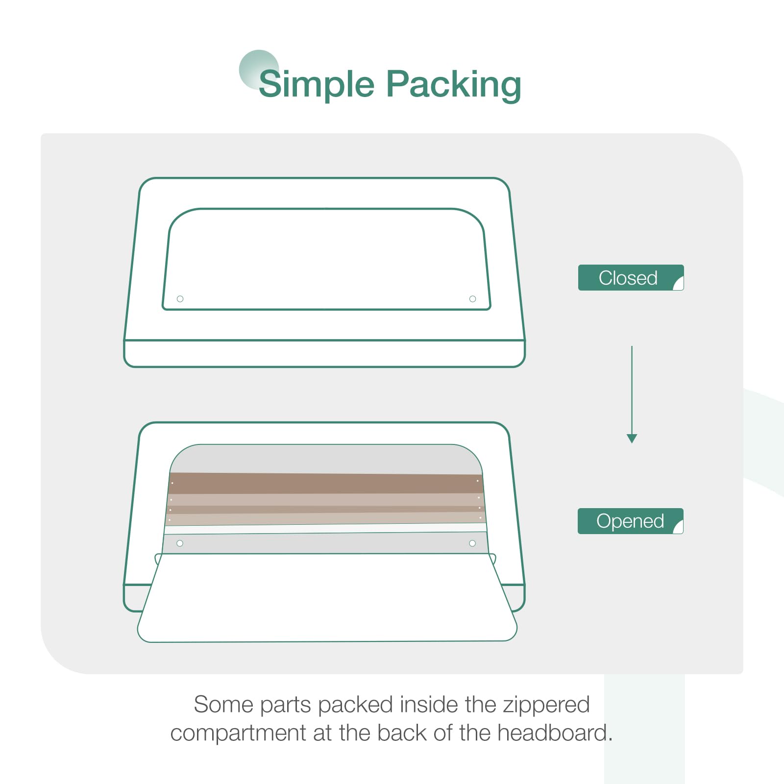 - All necessary parts and instructions are packed inside the zippered compartment at the back of the headboard for your convenience. Following the detailed instructions for quick assembly and TWO-PERSON assembly can reduce completion time to 20 minutes.