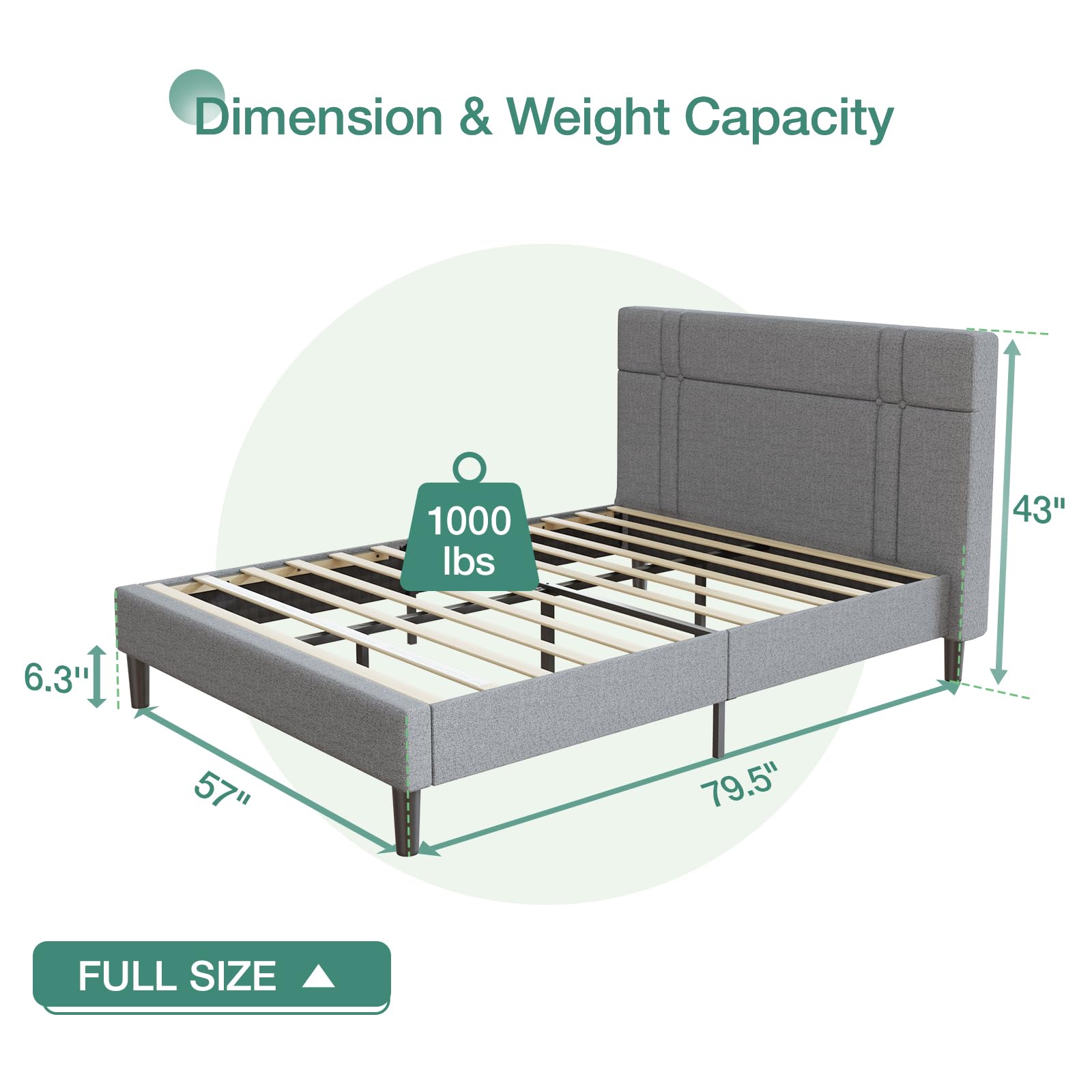 - Simple and elegant design of the full size bed frame, adds a touch of sophistication and comfort to you. The upholstered headboard is wrapped in high quality foam that provides excellent support for your neck and back.