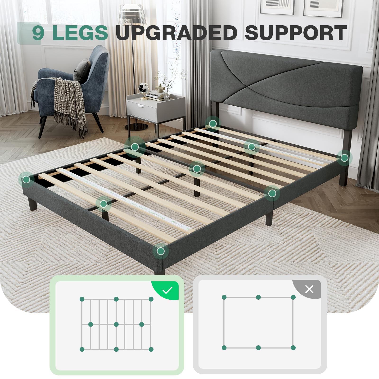 - Our bed frame queen size adopts a metal frame structure with high-density foam wrapped in the side, 12 articles evenly-spaced solid wood slats, and 9 Iron support legs to provide dense and strong support for up to 1200lbs, ensuring the firmness and stability of the queen bed frame.