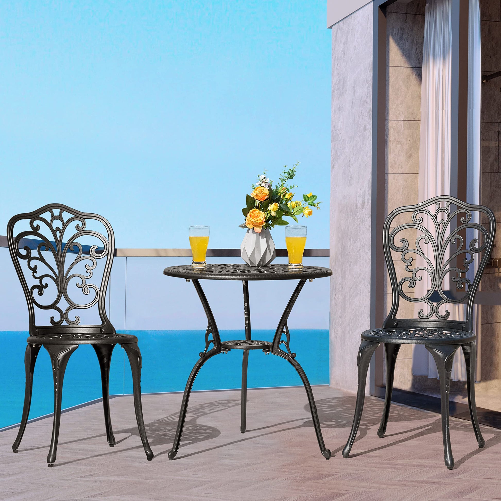- WEATHER-RESISTANT This small bistro table set is made from sturdy and solid cast aluminum, so it’s resistant to rust, weather, fade, chip or crack. With durable finish and carefully made instruction, it can last season after season