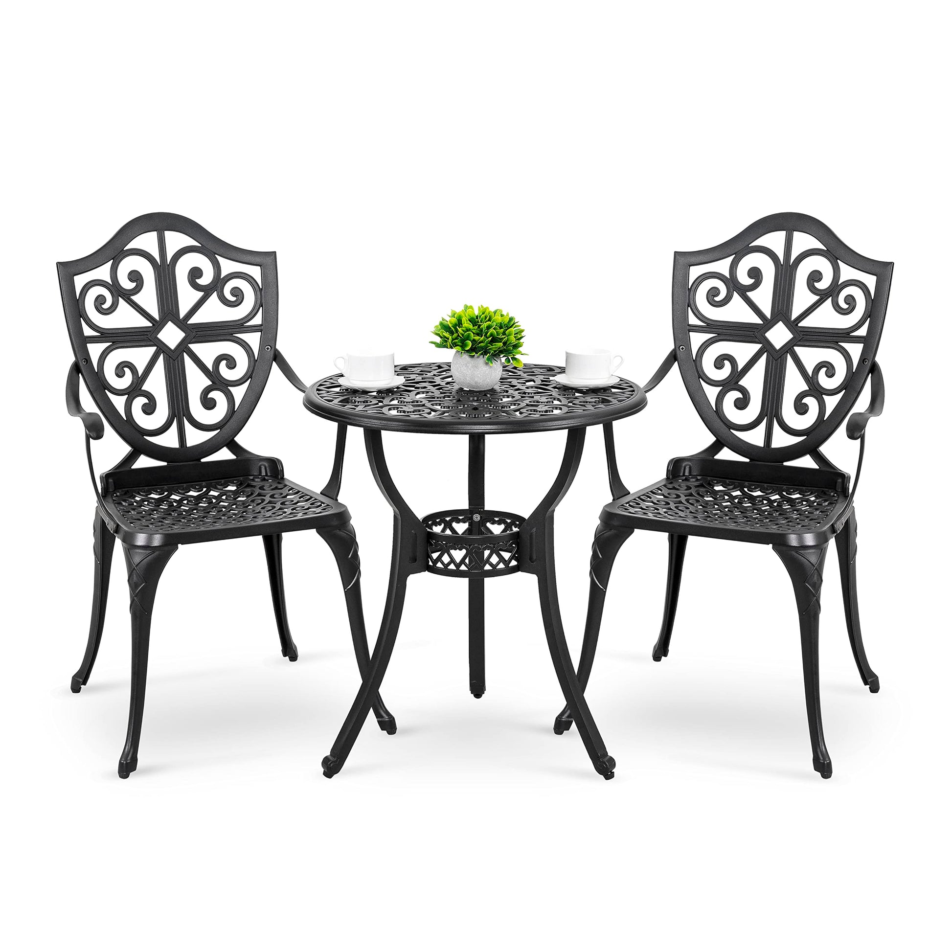 - Ergonomic Design: Ergonomic back and concave seat provide excellent support for your lumbar and back to lie down, and curved armrests give arms space to rest on. Its simple and modern black design of outdoor bistro table and chairs set for 2 goes well with any outdoor environments