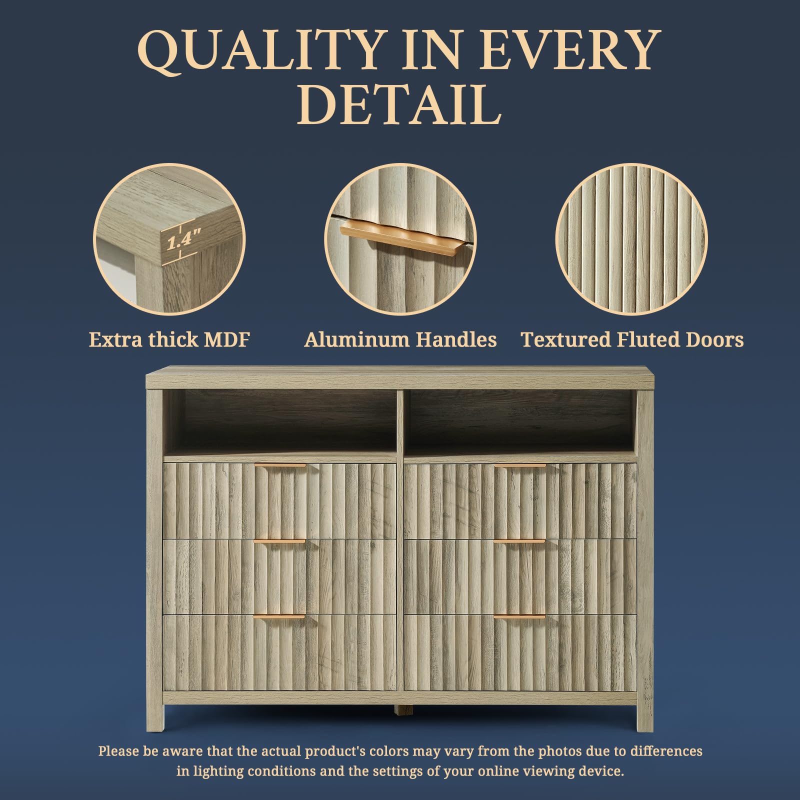 Oxford Fluted 6 Drawer Dresser for Bedroom, Wide Modern Wooden Chest of Drawers