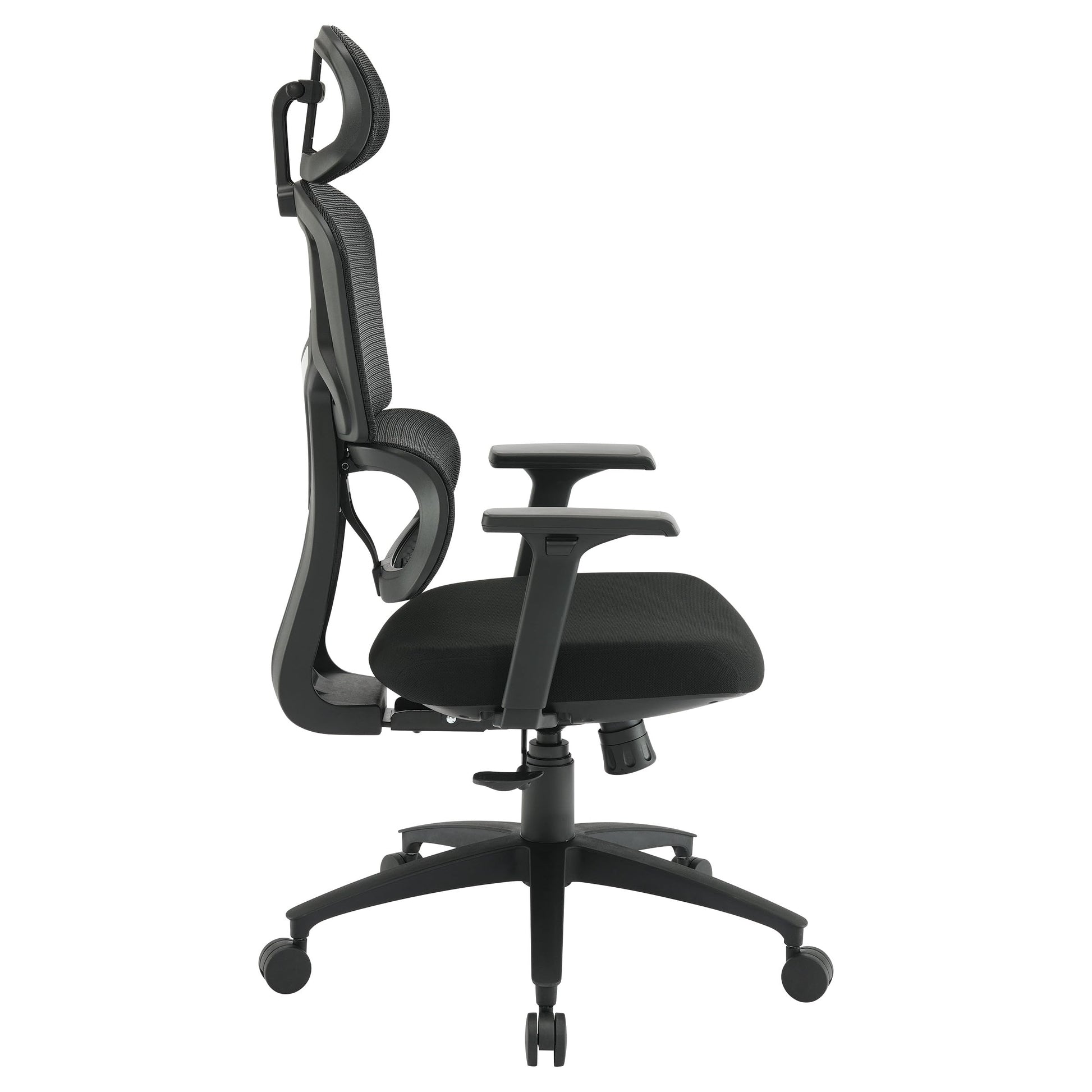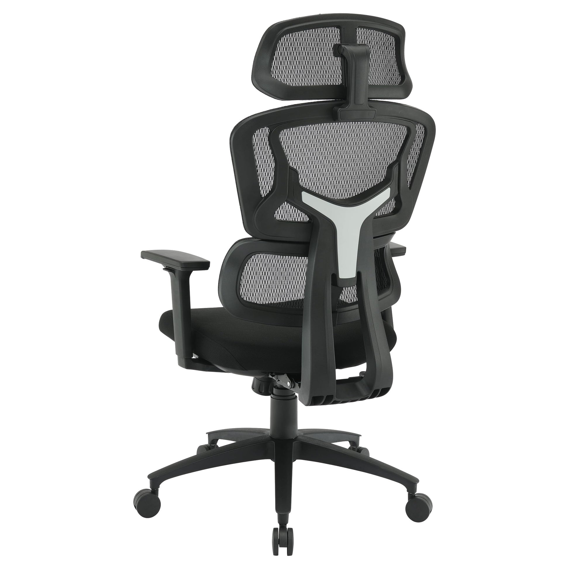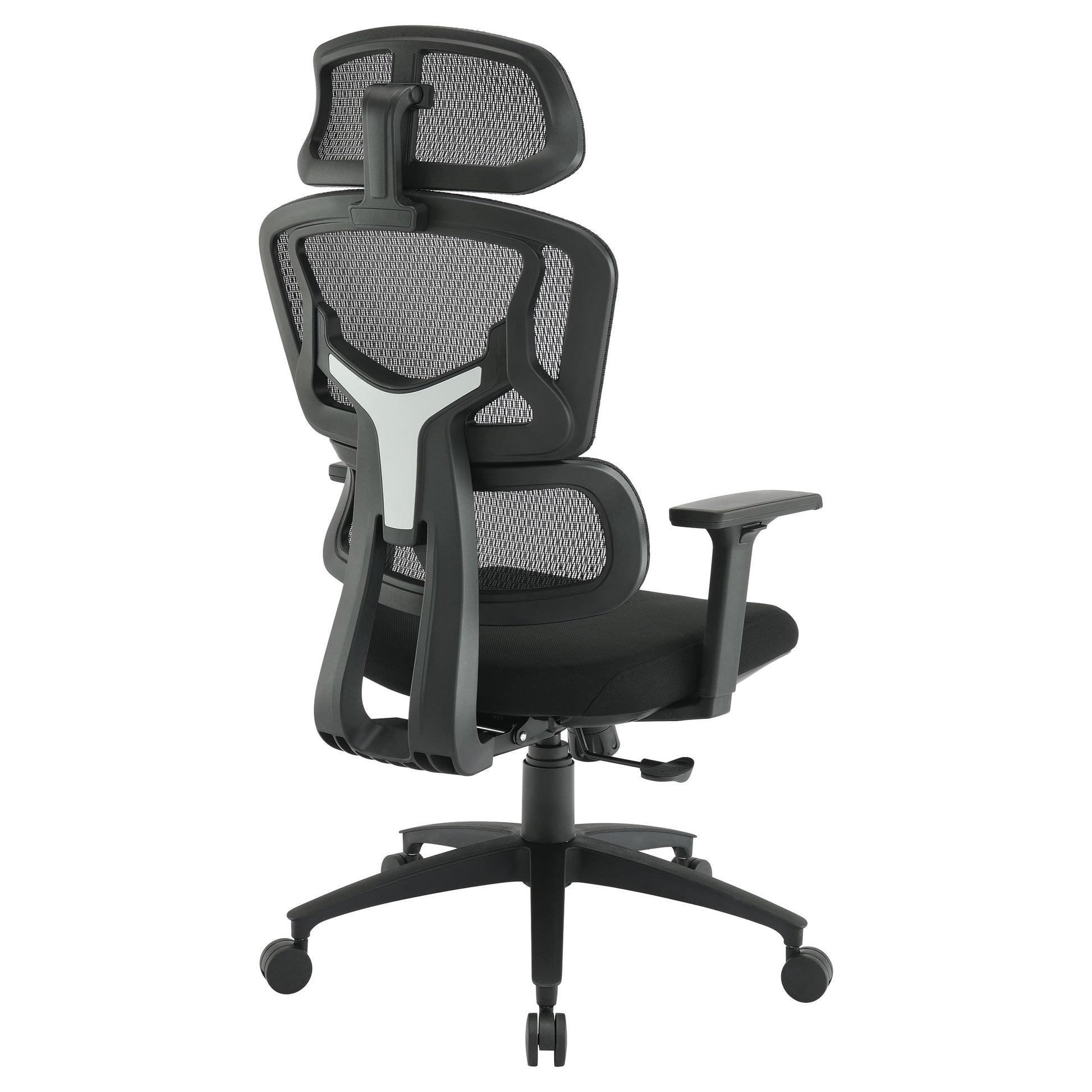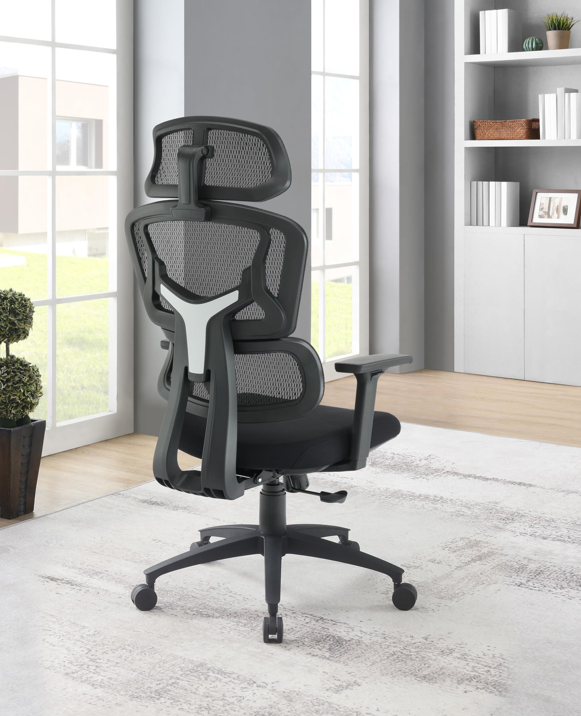 - Our Manager's Chair, featuring a breathable mesh back with built-in lumbar support, adjustable headrest and padded fabric seat, ensures all-day comfort.