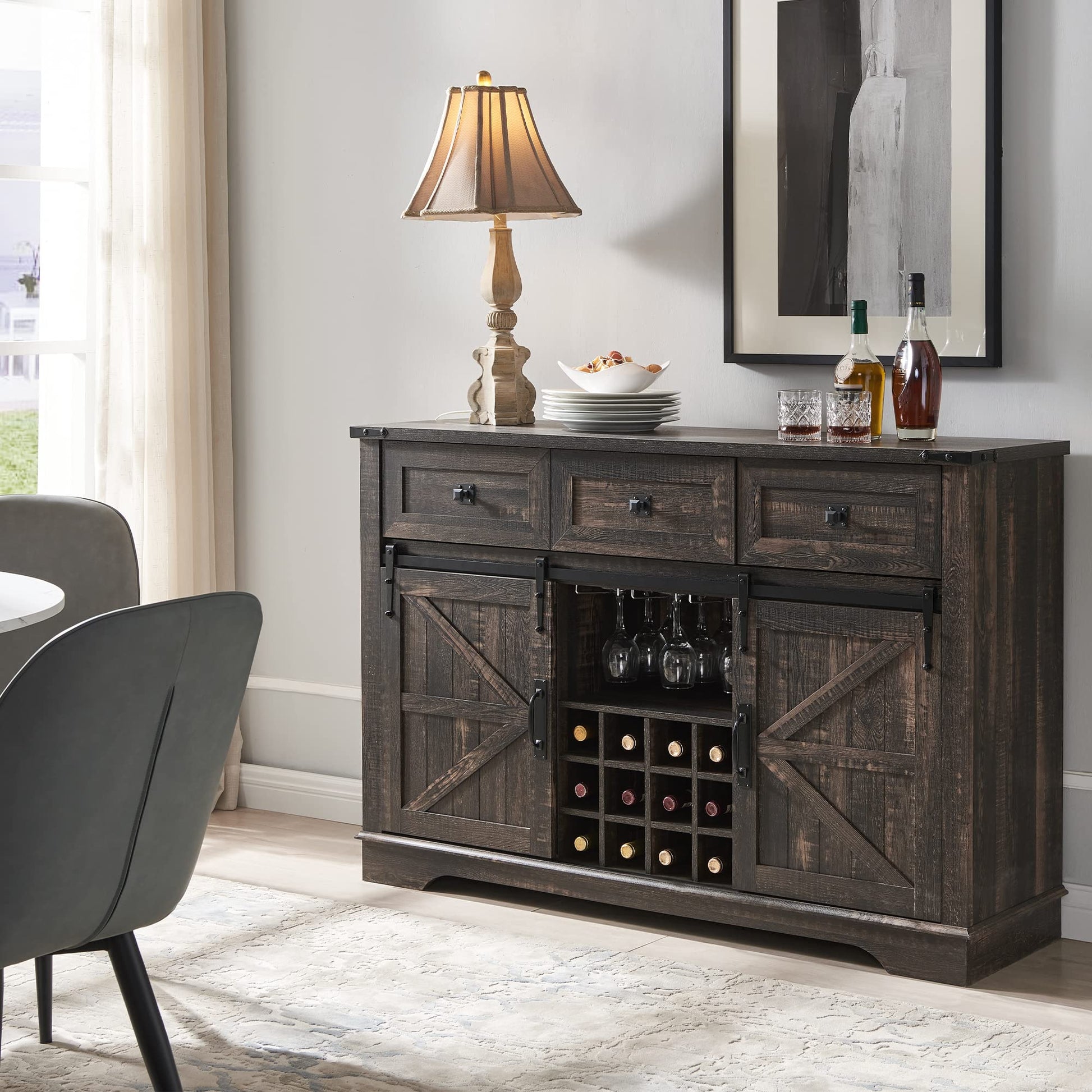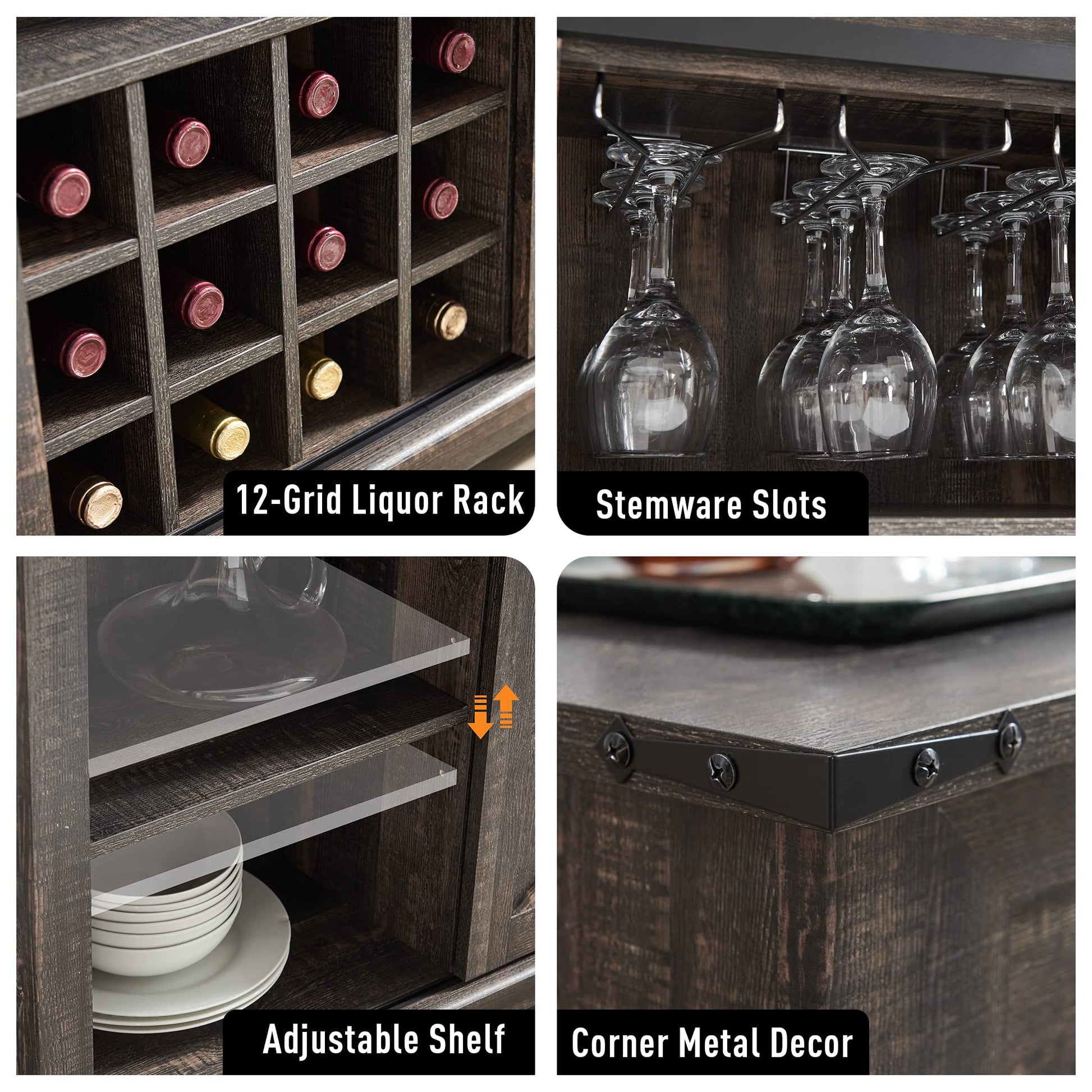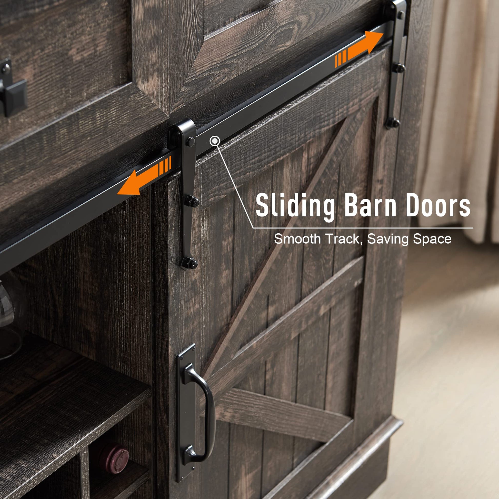 - SLIDING BARN DOORS: Easy access to the home bar cabinet via sliding metal track, designed for smooth and quiet slide. Allows you to hide or reveal this home bar furniture freely. Flexibly divide it into different storage and display areas.
