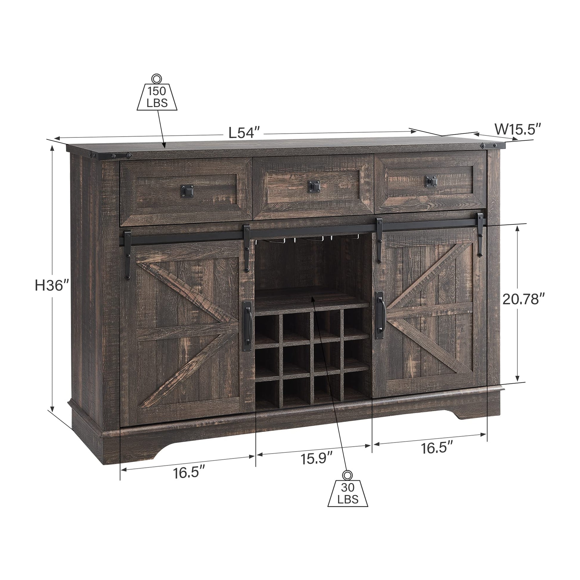 Color Dark Rustic Oak Recommended Uses For Product Home Bar Cabinet Product Dimensions 15.5"D x 54"W x 36"H Special Feature Sliding Barn Door