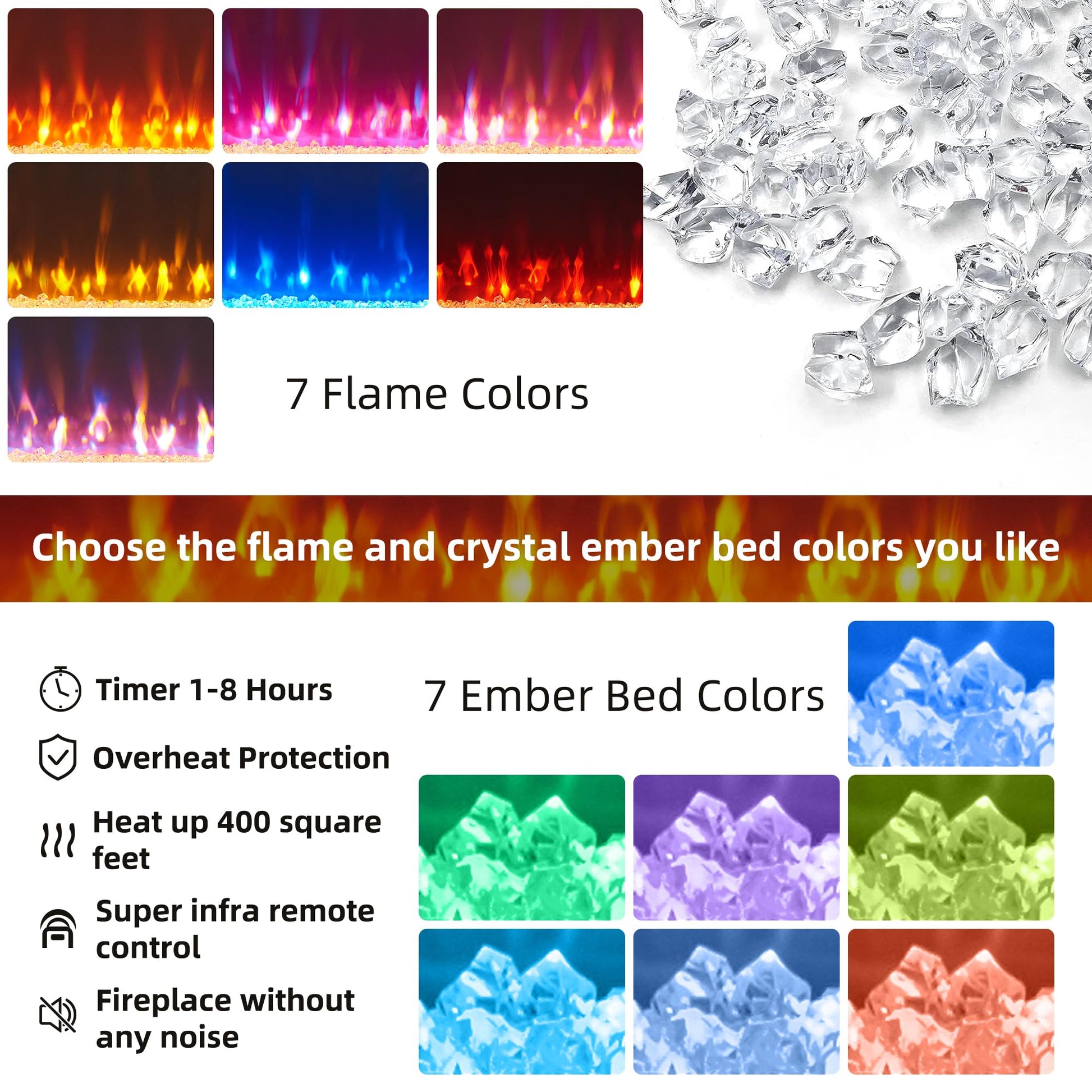 - Better Customized Ambiance 7 adjustable flame color options, also 7 adjustable LED lighting colors on the ember bed and cabinets, providing a captivating atmosphere tailored to your mood, decor, or preference, and the shining crystal will highlight the inherent beauty of each realistic fire. Then all these functions could be finished easily by the super infra remote control