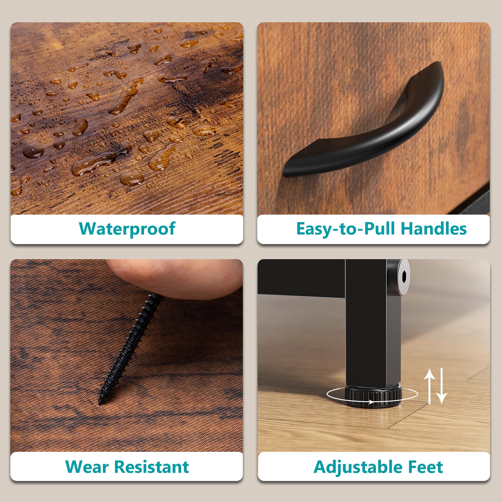 - MDF boards with steel frames, cross support bars and a drawer support shelf are combined to make this drawer sturdy under full load(66lbs). With 4 adjustable feet, there is no need to worry about stability while it's adaptable to different spaces. Anti-tipping accessories are also equipped to prevent accidents.