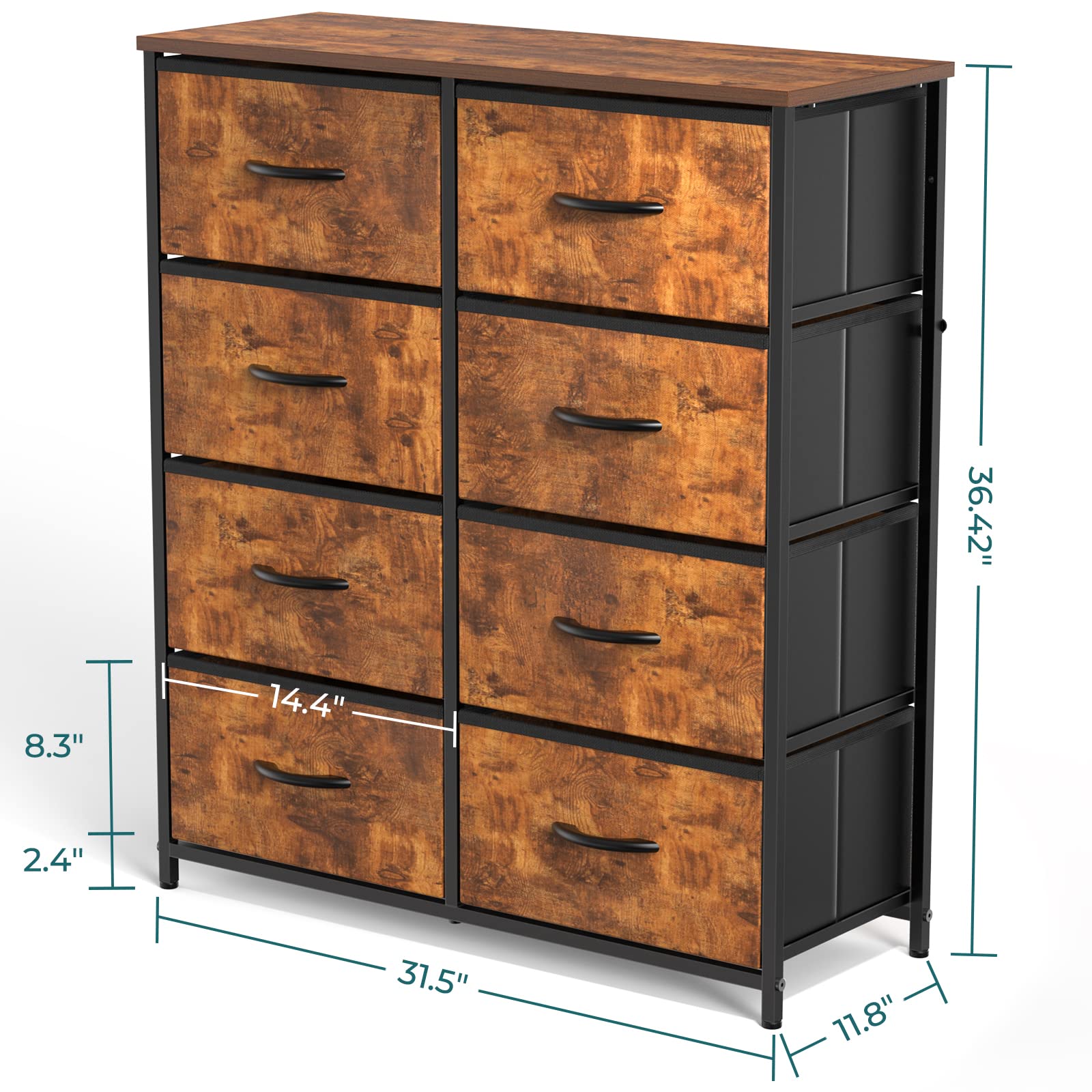 - This dresser offers 8 drawers, providing sufficient space for daily necessities organizing. The wooden top of the bedroom dresser is great for keeping the most-used items within your reach. Drawer dimensions: 14.4" L x 11.8" W x 8.3" H.