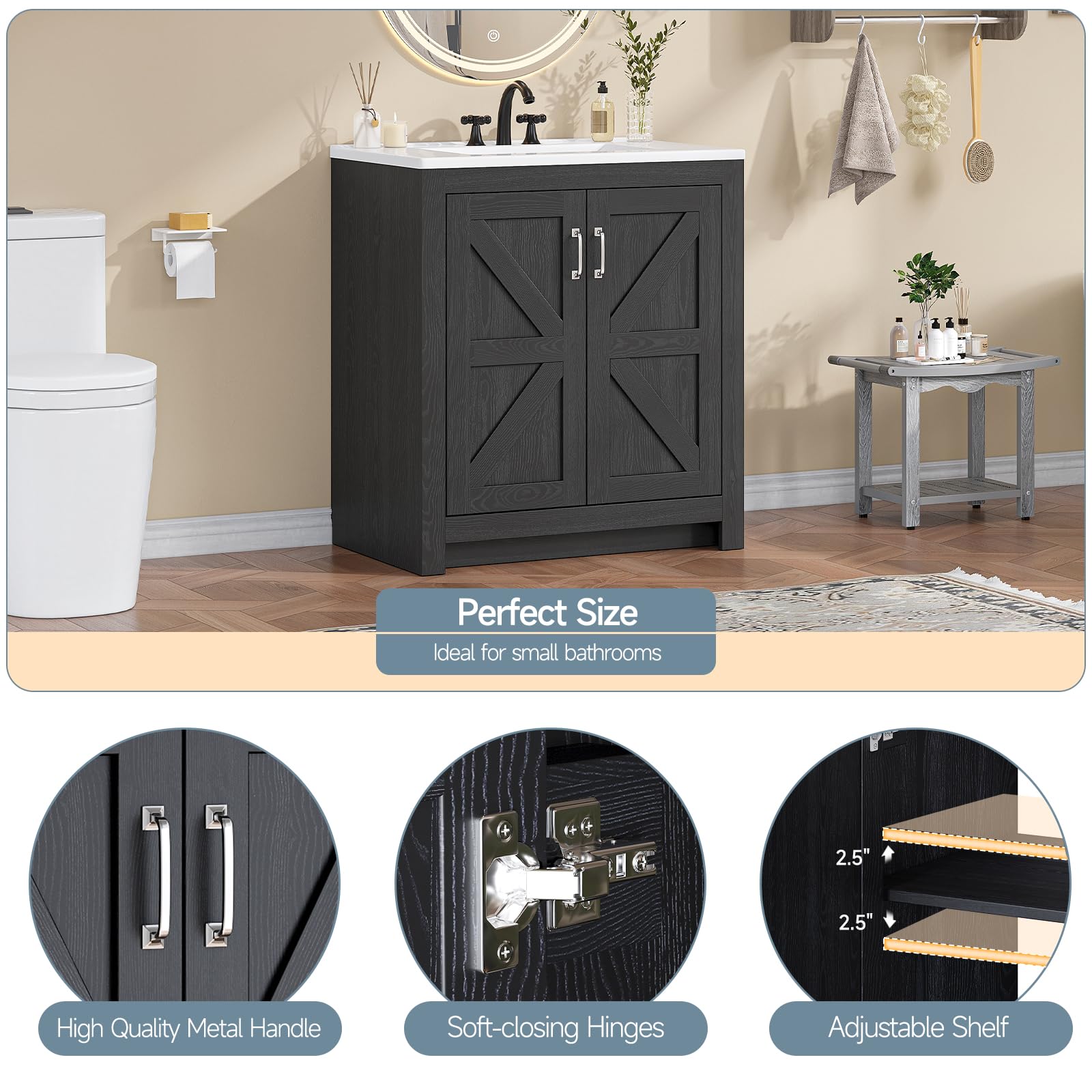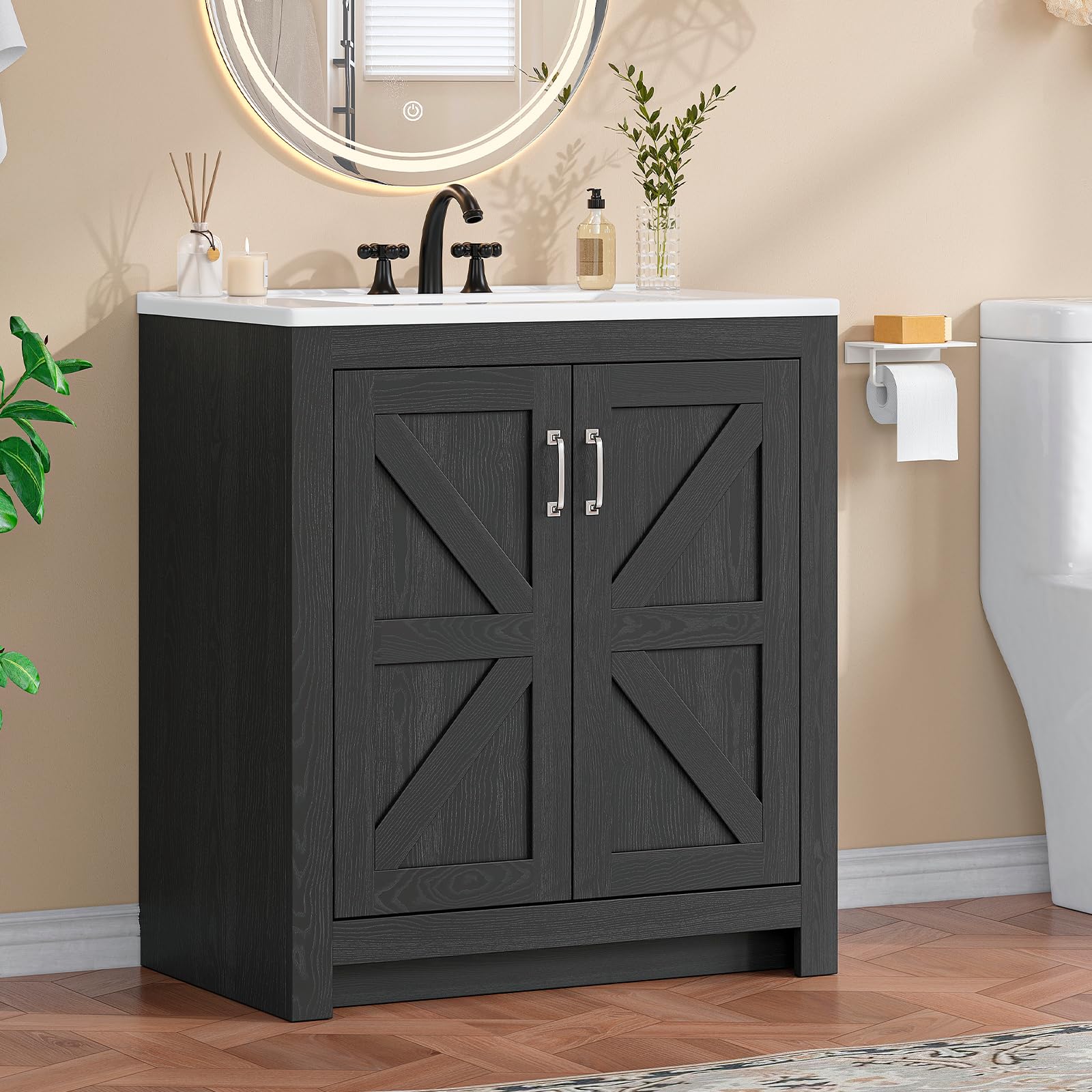 ONBRILL Farmhouse Bathroom Vanity with Sink, Freestanding Bathroom Vanities with Ceramic Basin & Soft-Close Door, Wood Storage Cabinet with Adjustable Shelf for Apartment & Small Space (Black, 30")
