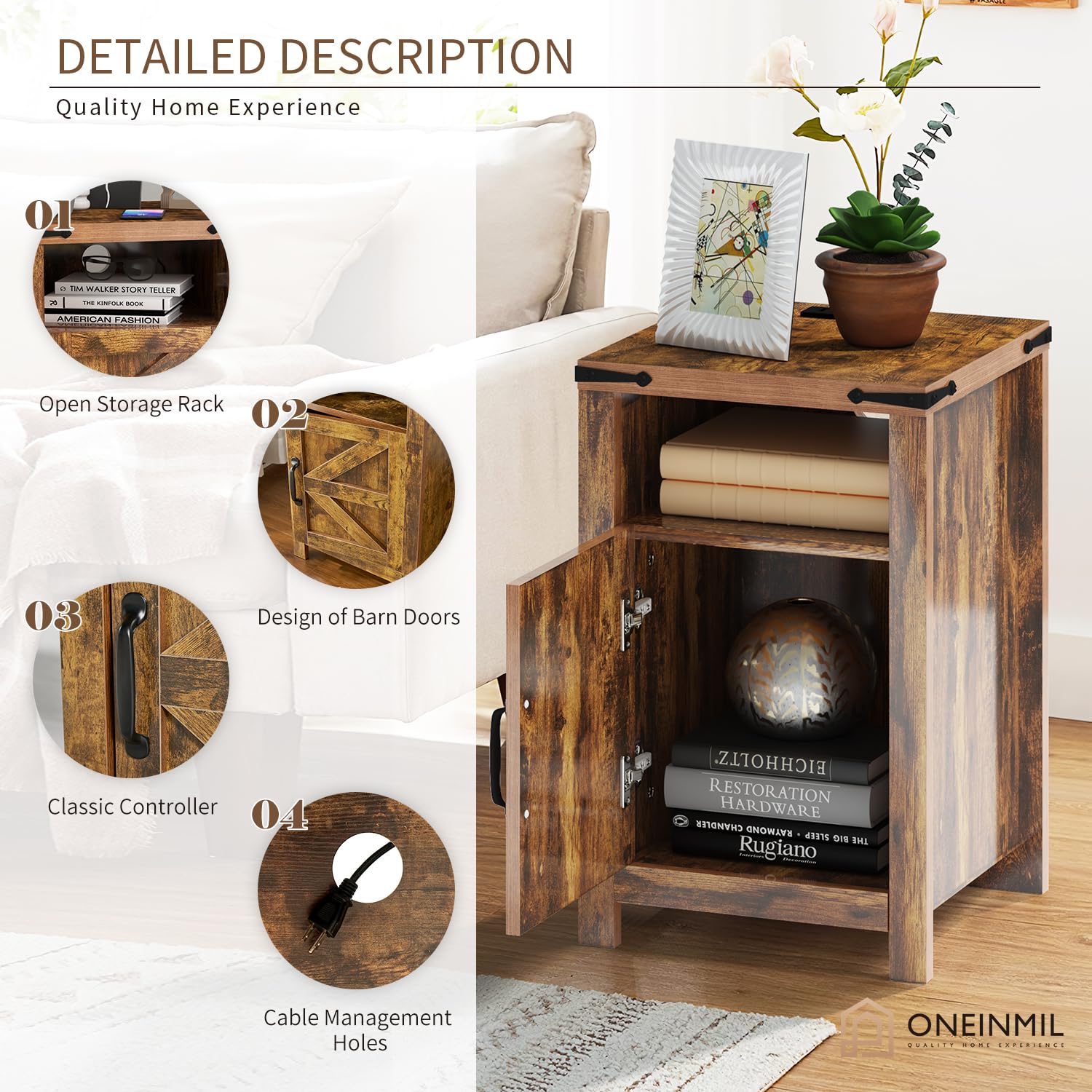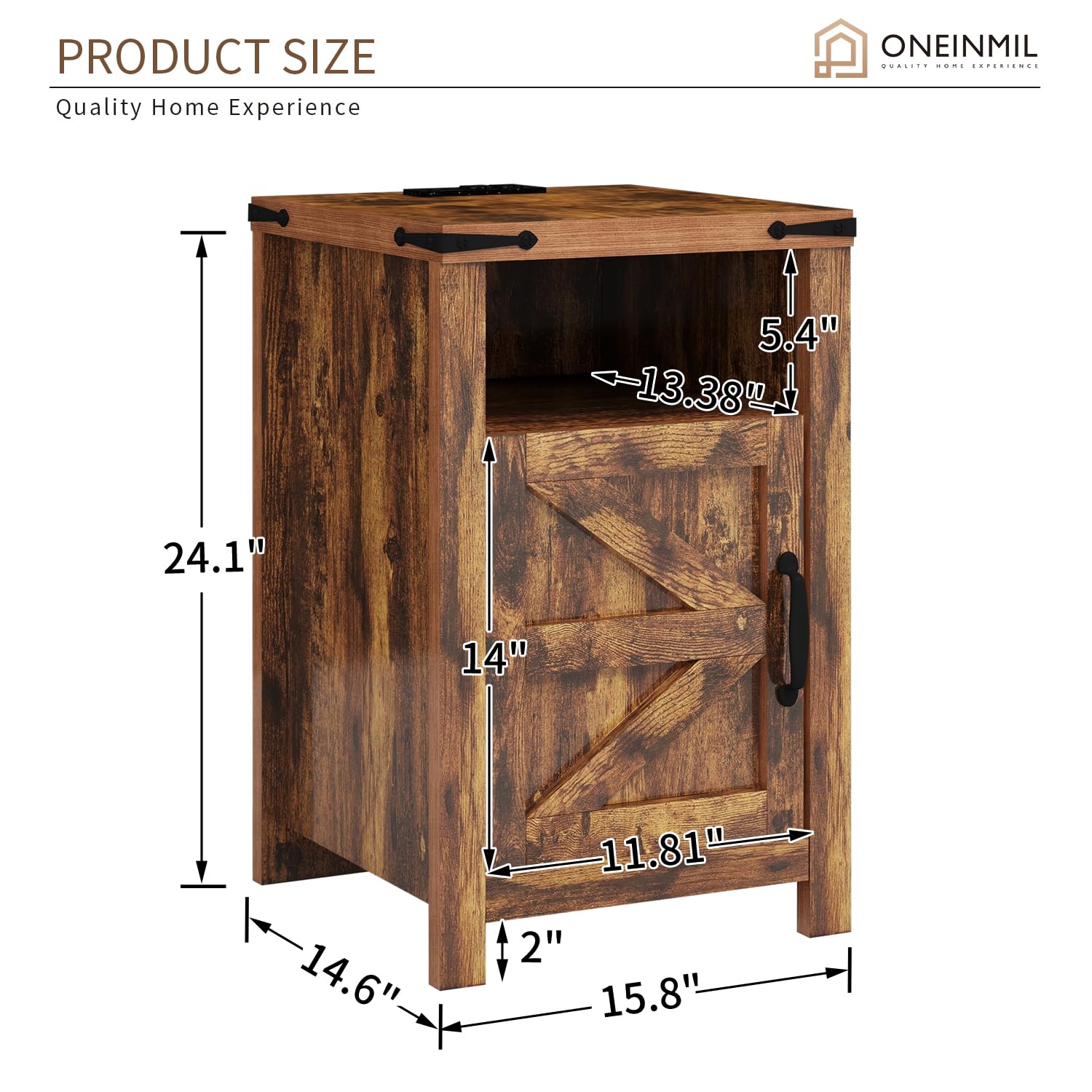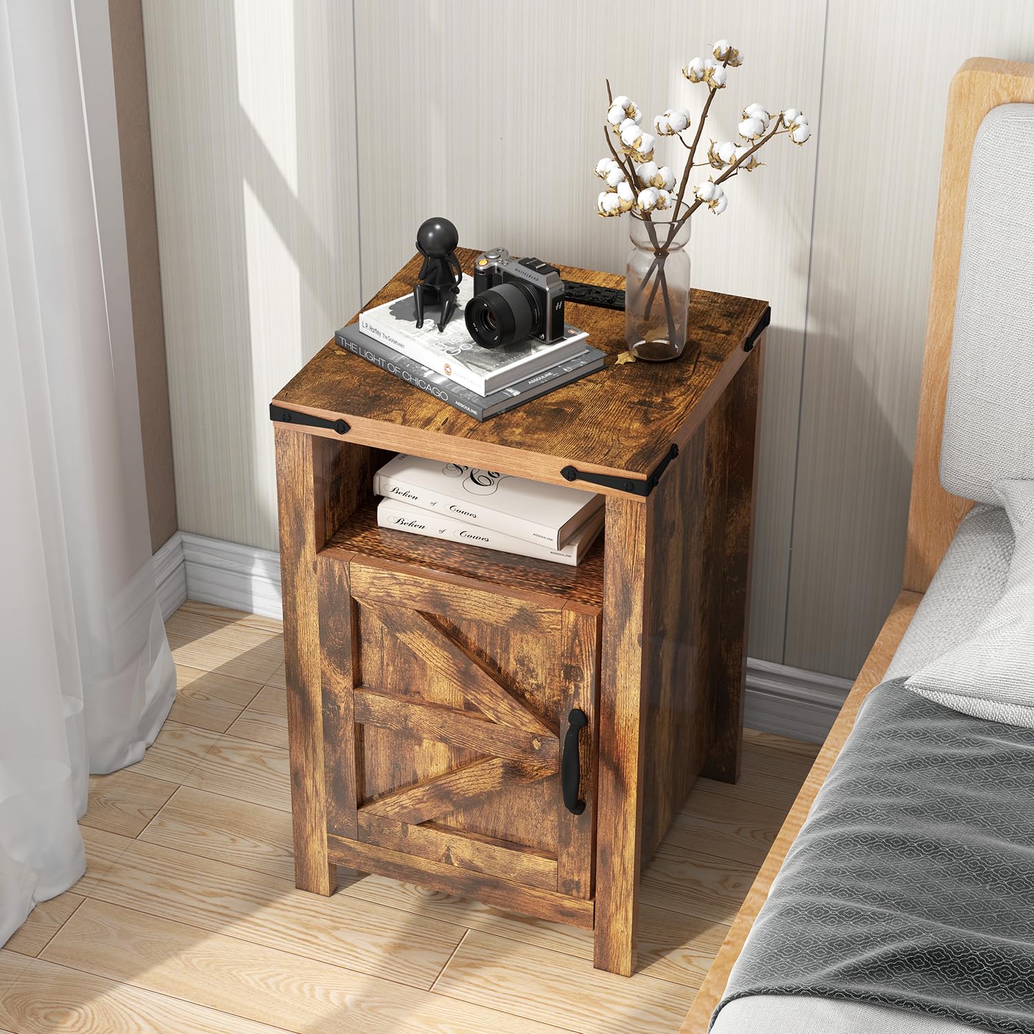 End Table with Charging Station, Farmhouse Nightstand with Barn Door