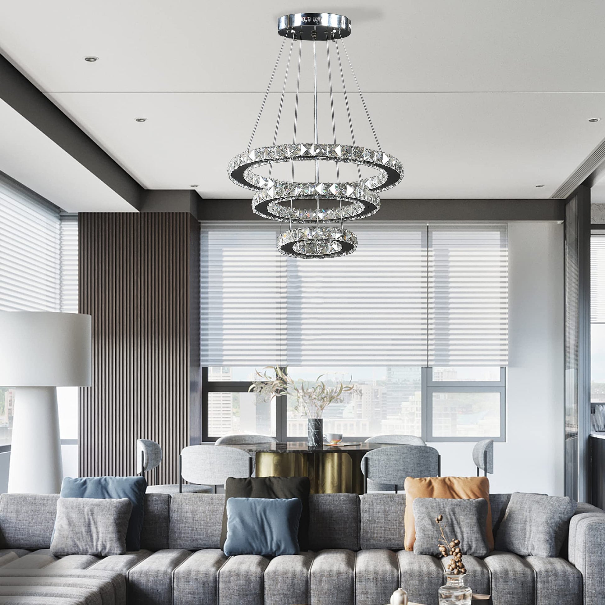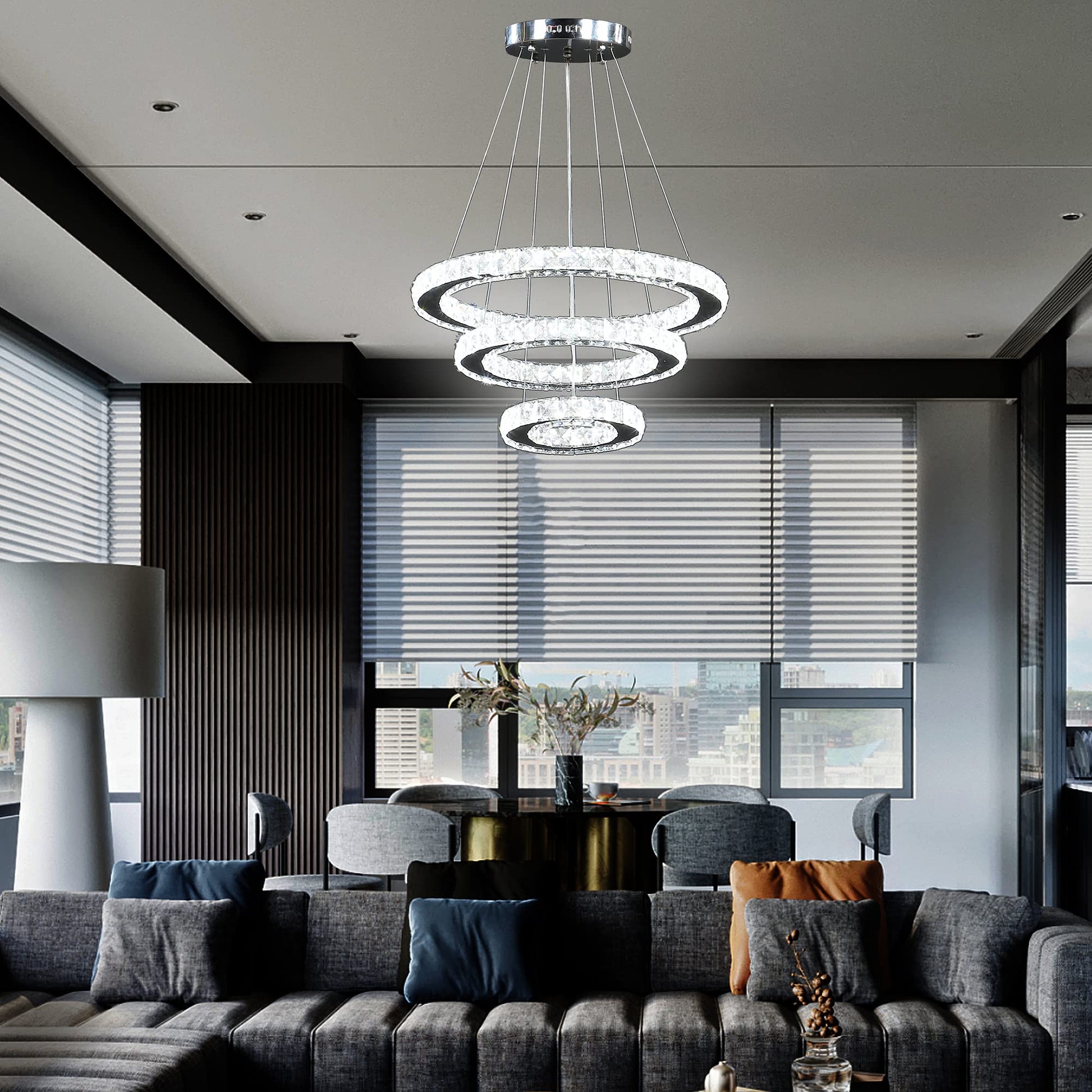 - Its feature with bubble-free, high clarity, low-dispersal properties, and refractive index makes it a good choice for inclusion in high-quality light fixtures. This 3-light unique chandelier fuses playful glam whimsy with a modern, sleek design to elevate your living or dining room. It's crafted from stainless steel with a circular canopy and height-adjustable barely-there wires. The body features three tiers of elegant ring lights with built-in LEDs – arrange them in a V-shape or at different angles for an abstract, sculptural look. We love that these circles appear to be floating in the air, with glittering clear crystal accents that bounce light around the room