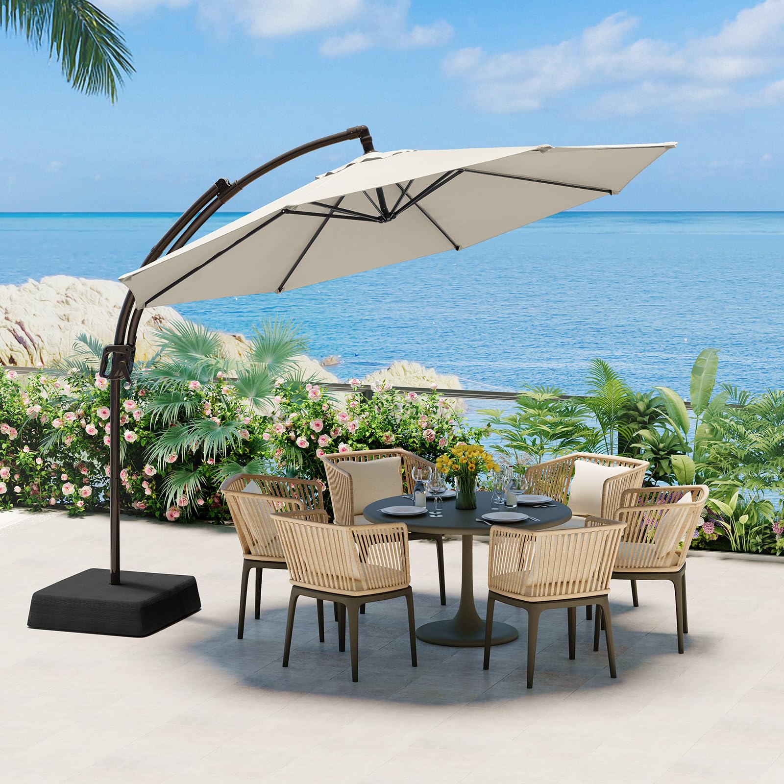 - This patio pool umbrella comes with a sturdy detachable base, fill the bottom of the garden umbrella with at least 360 pounds of sand, then secure the sandbag in place, whether it's on a sunny pool deck or at a patio party, just place the umbrella next to it to block out the midday sun, allowing sunshine and coolness to coexist perfectly.