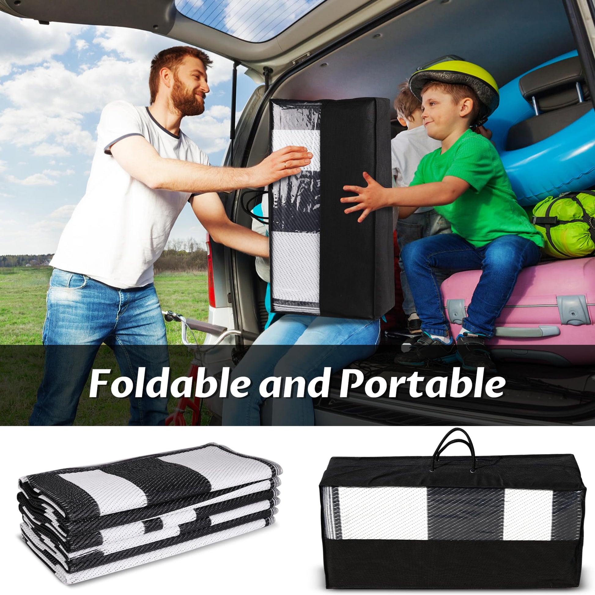 - Classic Black and White Striped Design, 9x12ft Large outdoor rug is perfect for every outdoor camping trip in the summer, just lay it flat on the ground. Outdoor plastic straw rug creates a relaxed and enjoyable outdoor living for you.