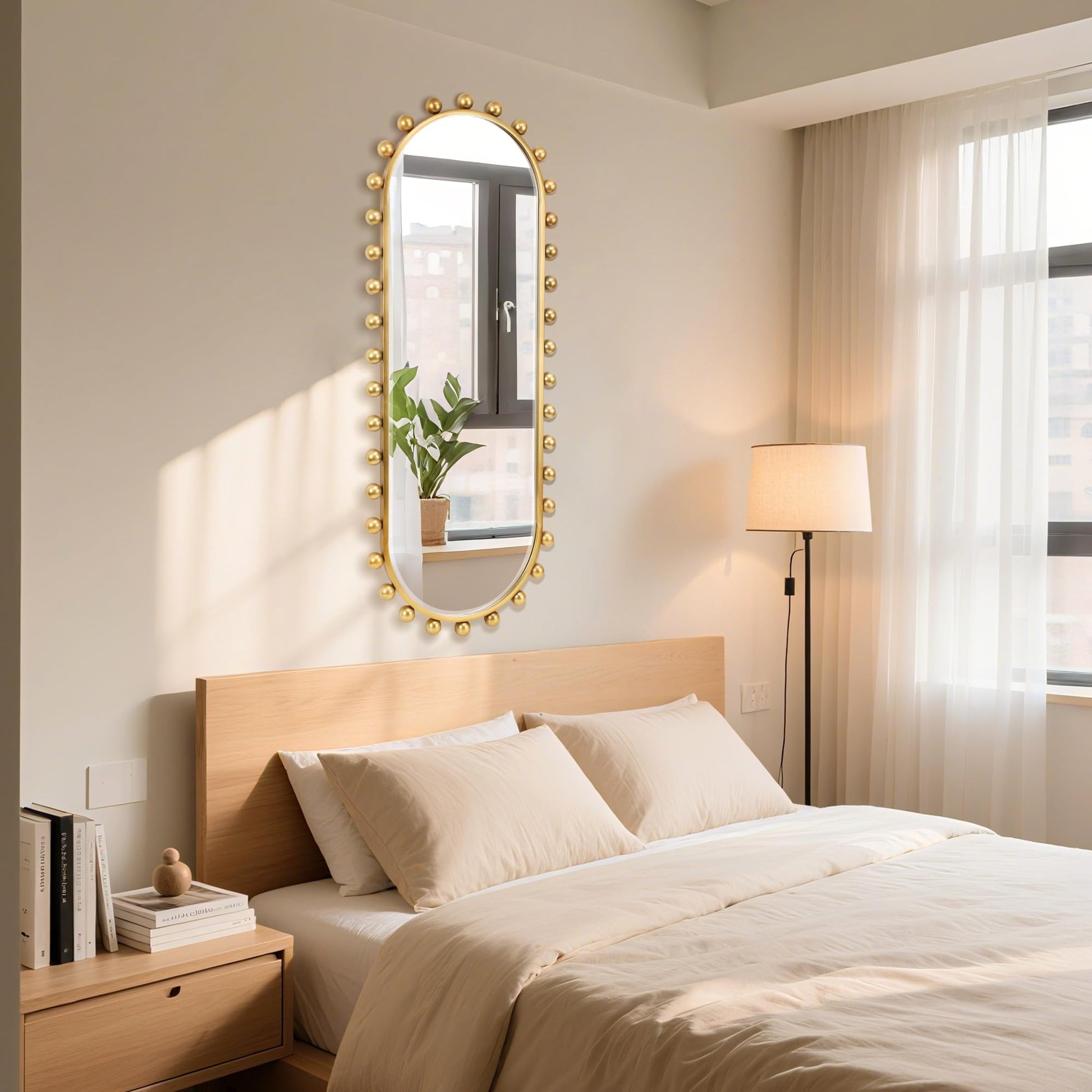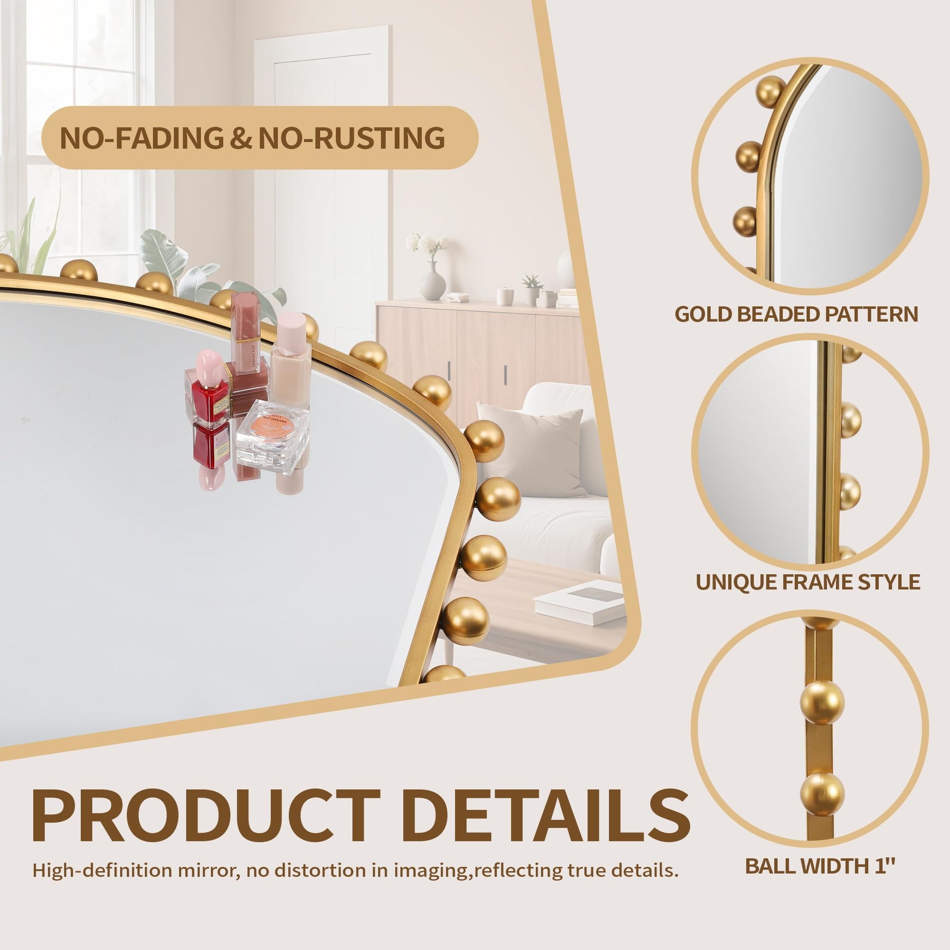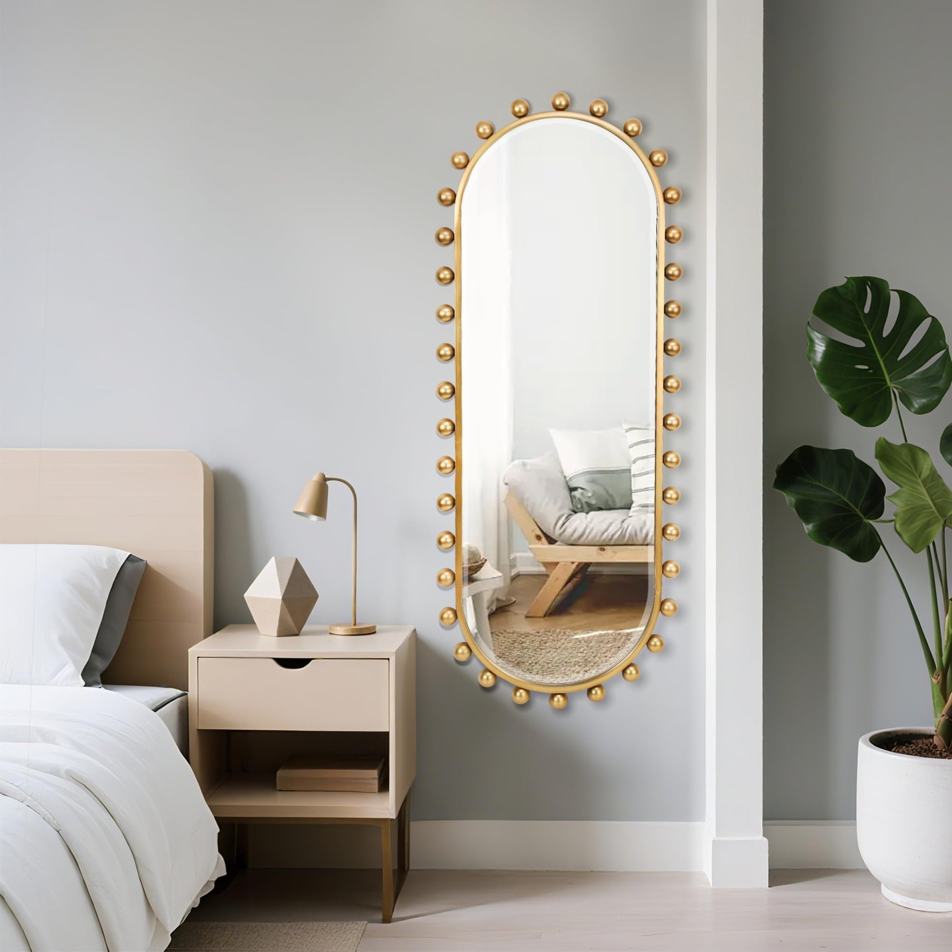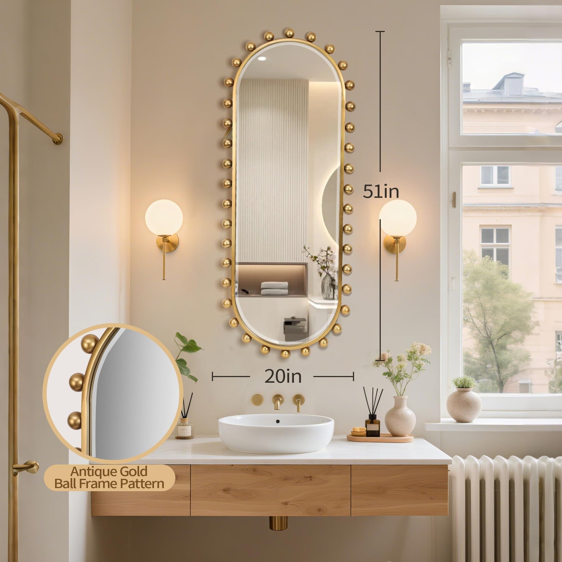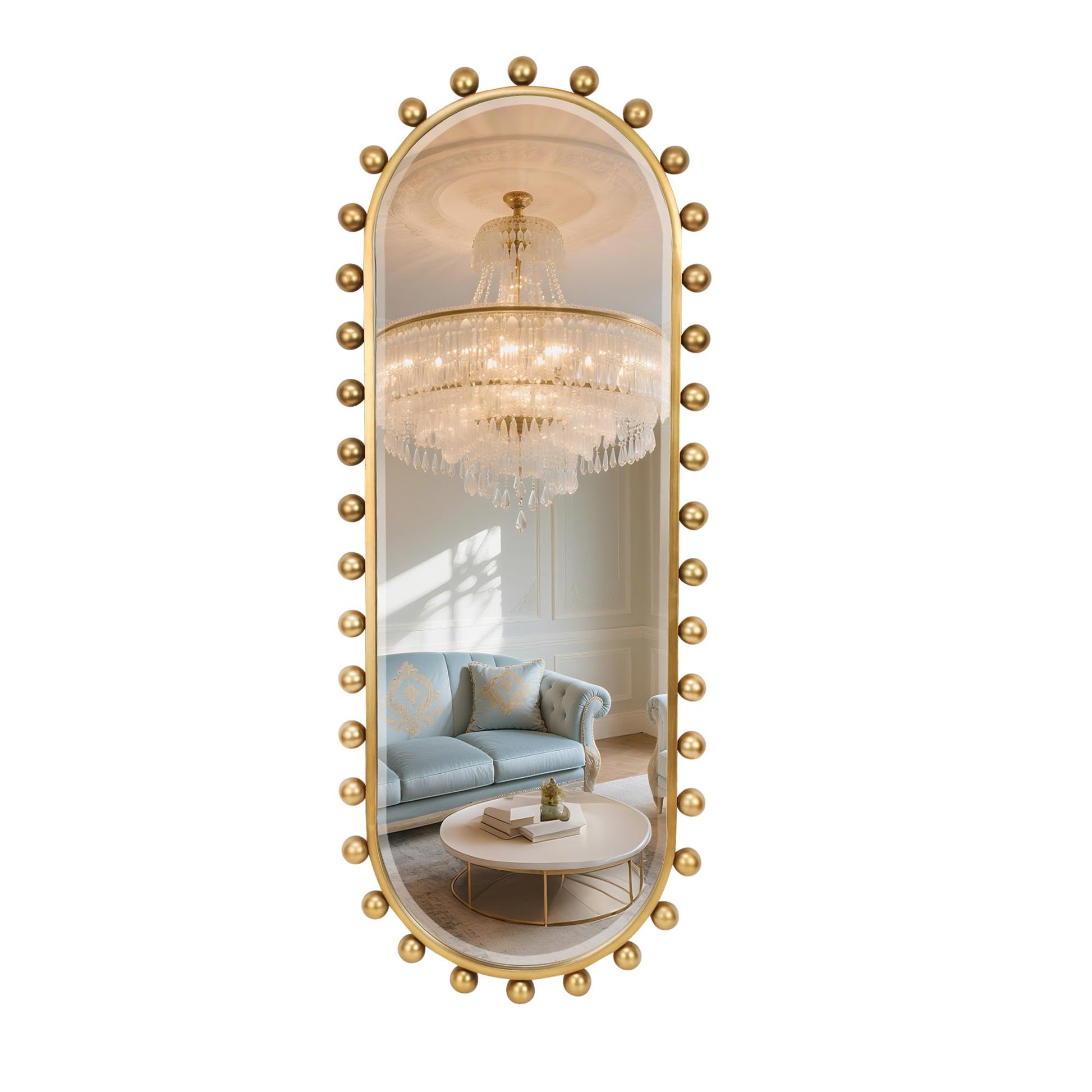 Elevate your space with this stunning oval full-length mirror featuring an elegant antique gold ball frame design. The beveled edges add depth and sophistication, while the versatile mounting system allows for both horizontal and vertical installation. Perfect for bathrooms, bedrooms, dressing rooms, living rooms, and entryways.
