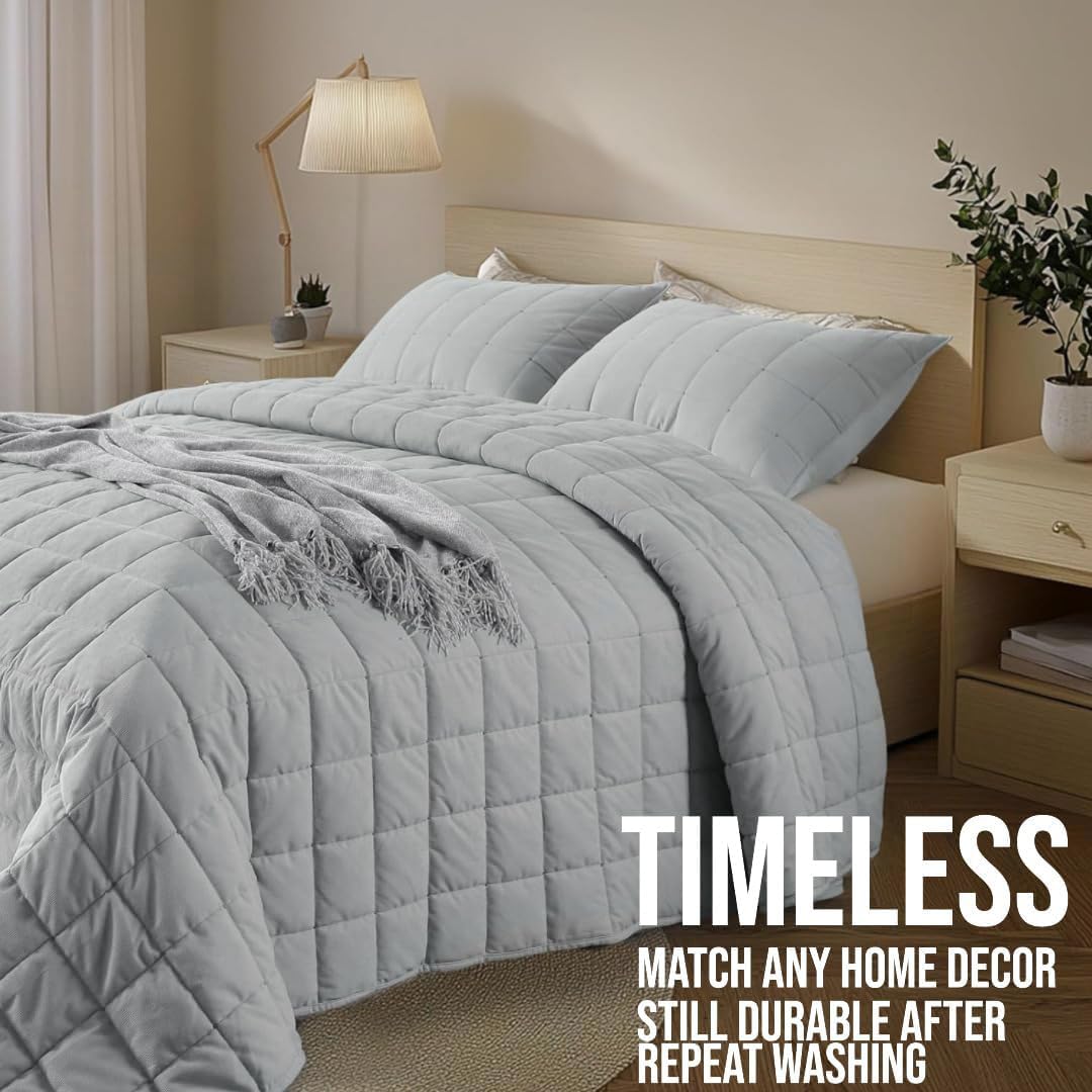 Elevate your sleep sanctuary with this sophisticated quilt set that combines Scandinavian-inspired simplicity with premium craftsmanship. The neutral silver grey palette seamlessly integrates into any bedroom color scheme while the oversized fit ensures your bed looks professionally styled.