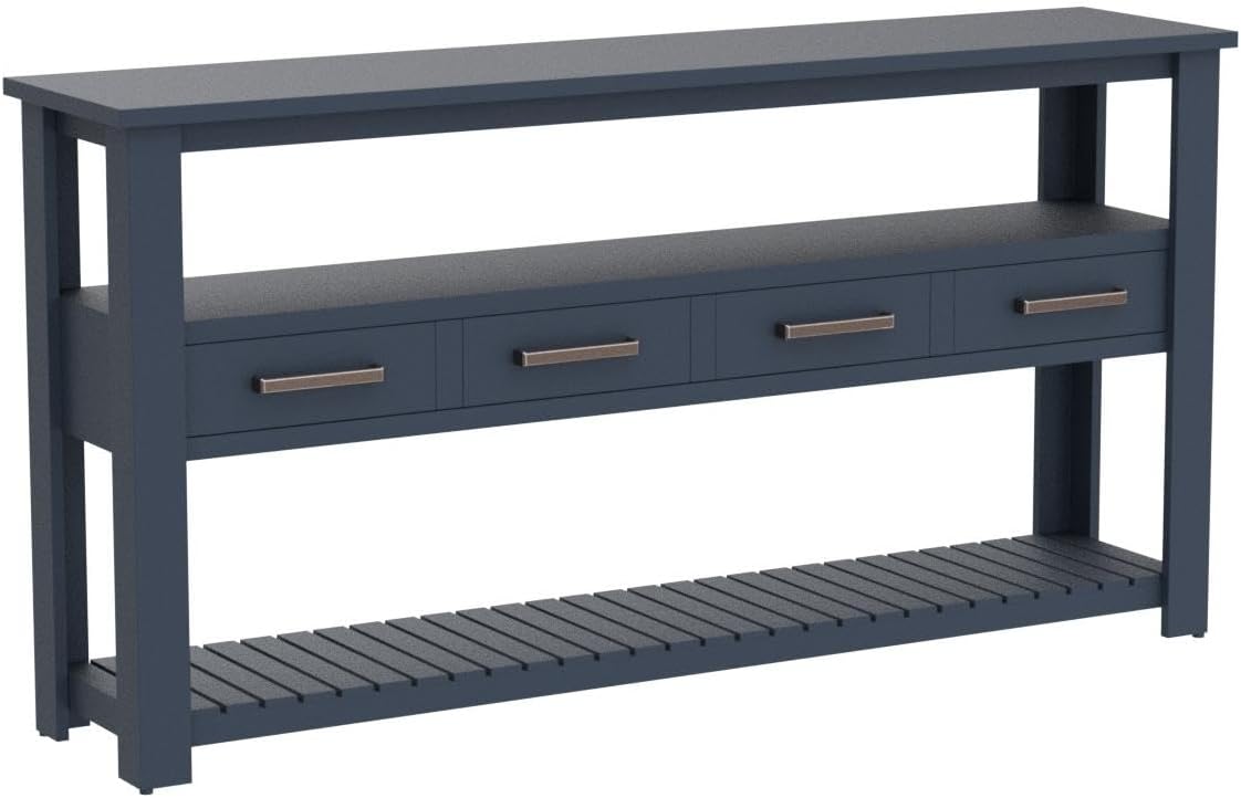 - This vintage long console table is functional designed to meet all kinds of storage demands. sidebaord table with four drawers and 2 shelves to provide large storage space for your files, sundries and daily necessities and keep organized. TableTop and middle board can place your beautiful vase, cute photos and decorations, additional knickknacks or a lamp.The bottom shelf is also helpful to collection