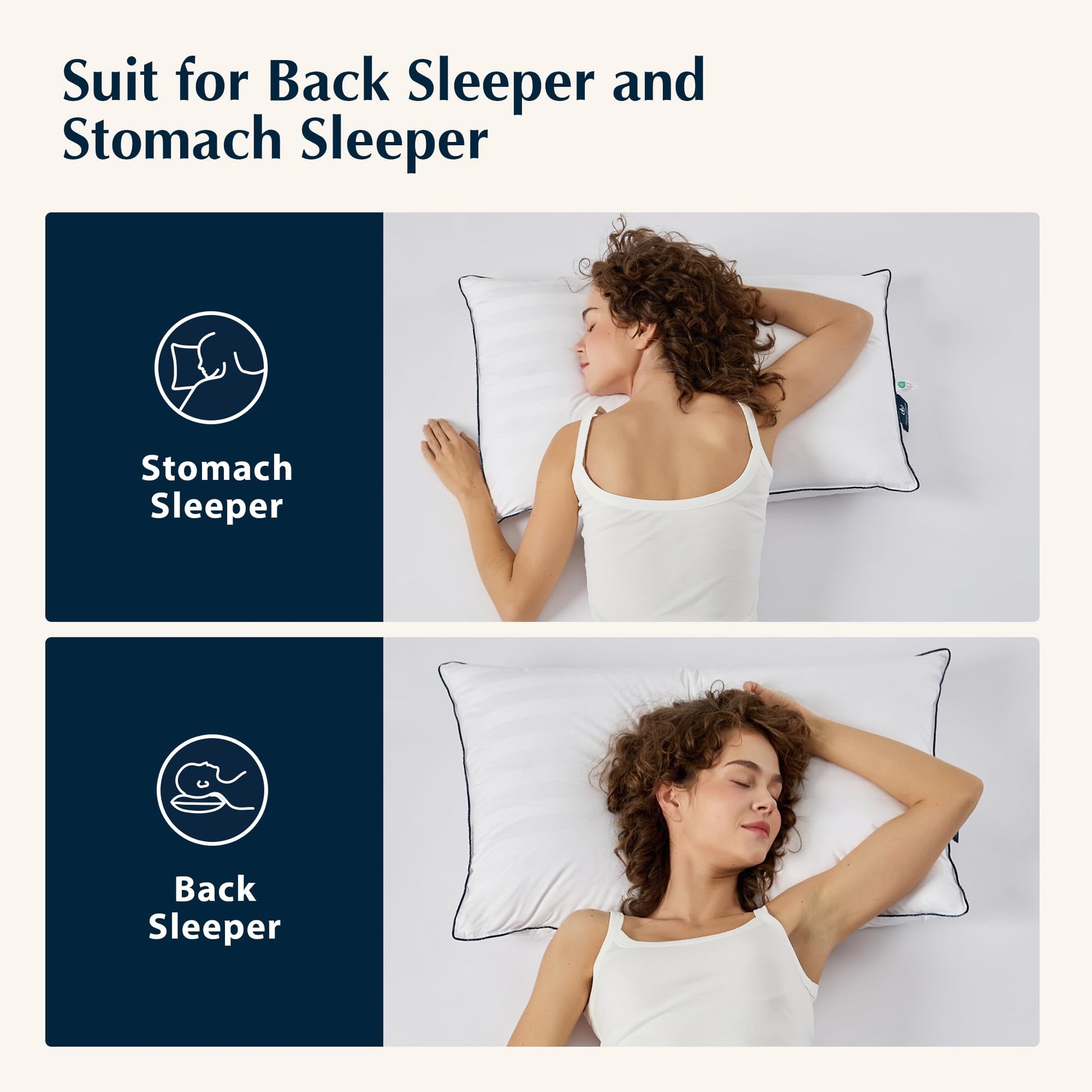 - Ideal For Back And Stomach Sleepers: If you like to sink "IN" your pillow. This 700 fill power down pillow is for you. This bed pillow is very soft, light and quiet. We fill it with the finest white goose down. Imagine sleeping longer, waking more rested and sleeping more comfortably.