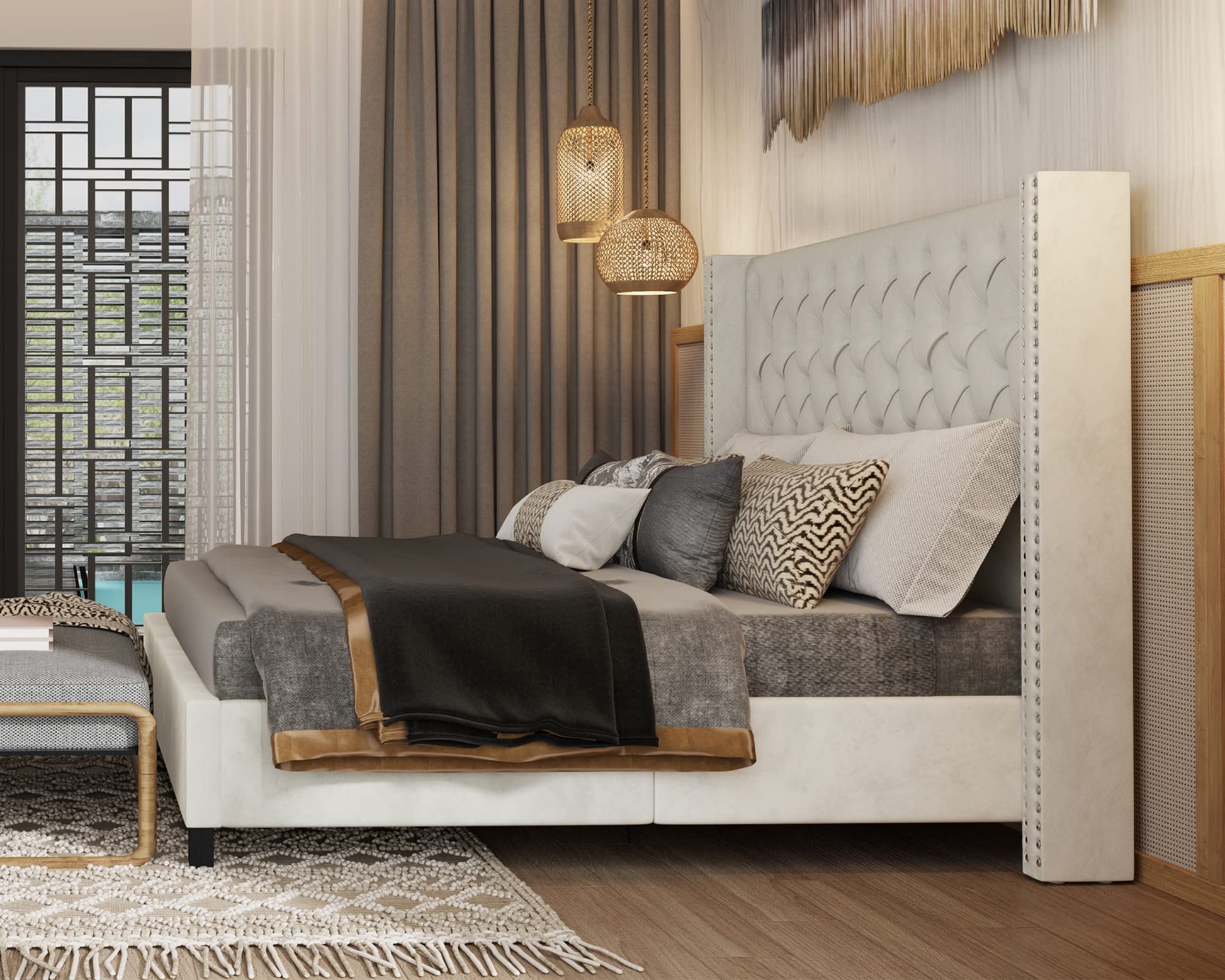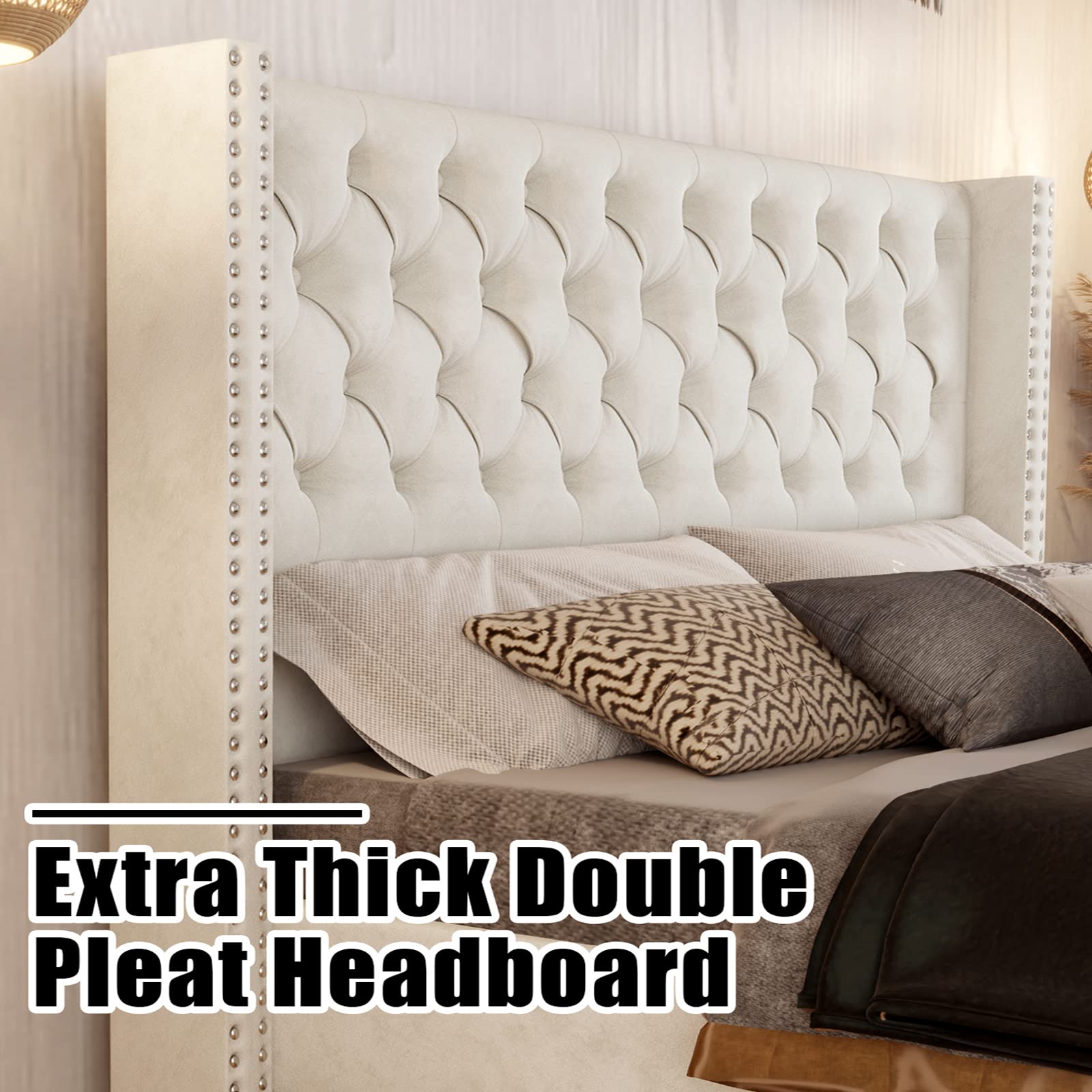 - Extra Large Headboard The bed frame has an extra tall high integrated headboard of 53.5 inches. It consists of 3 inches thick wingback with velvet tufting, which makes it more elegant and comfortable.