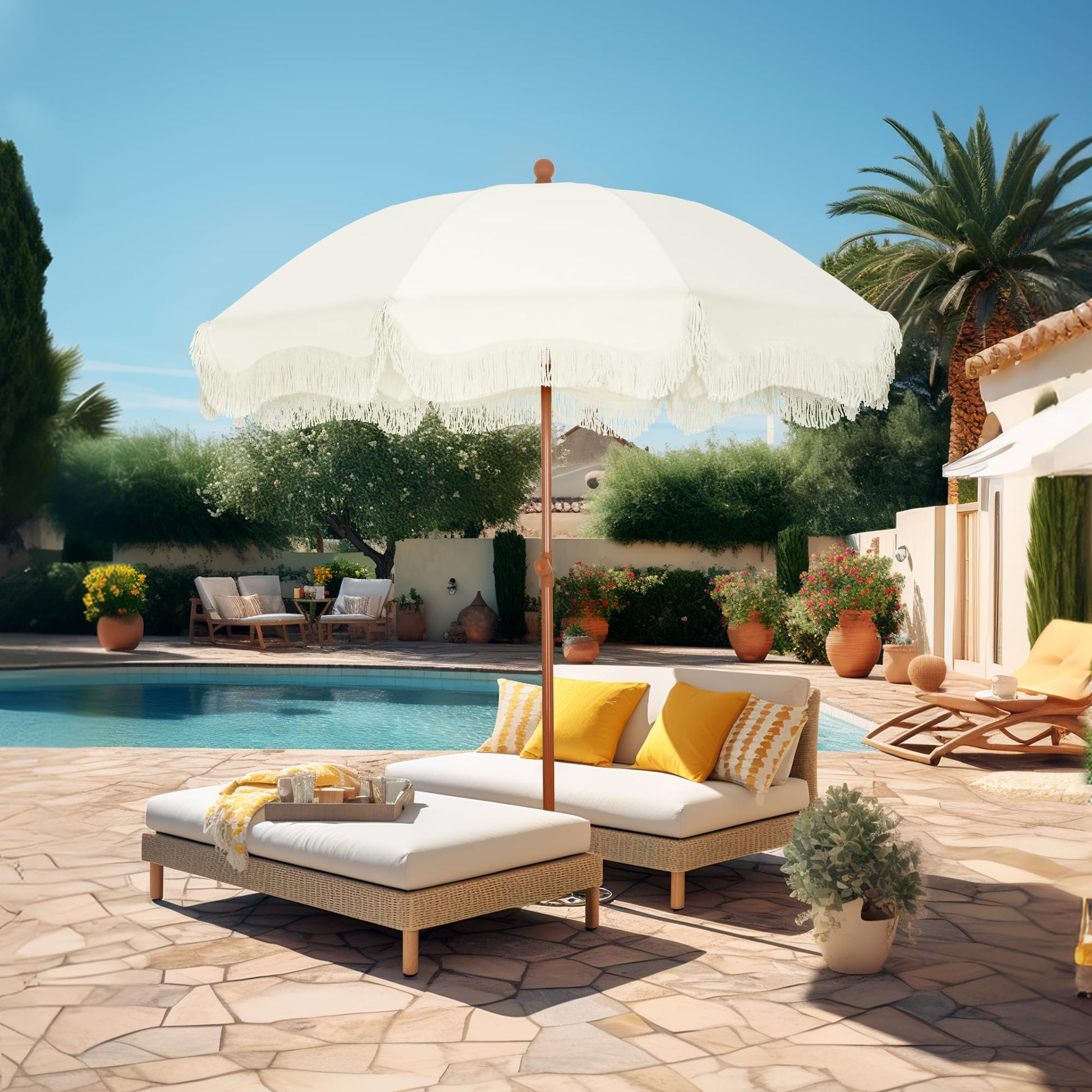 - Stylish and Vibrant Fringe Design: Available in four beautiful colors—white and blue stripes, whiye, sunset yellow, and sky blue—this 7ft patio umbrella with fringe adds a pop of color to your day at the beach. Its charming tassel design not only protects you from UV rays but also makes it a perfect decoration for gardens and great for sharing