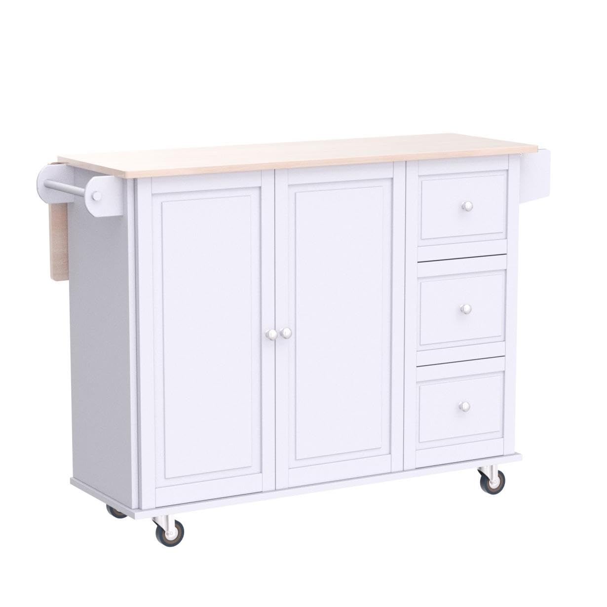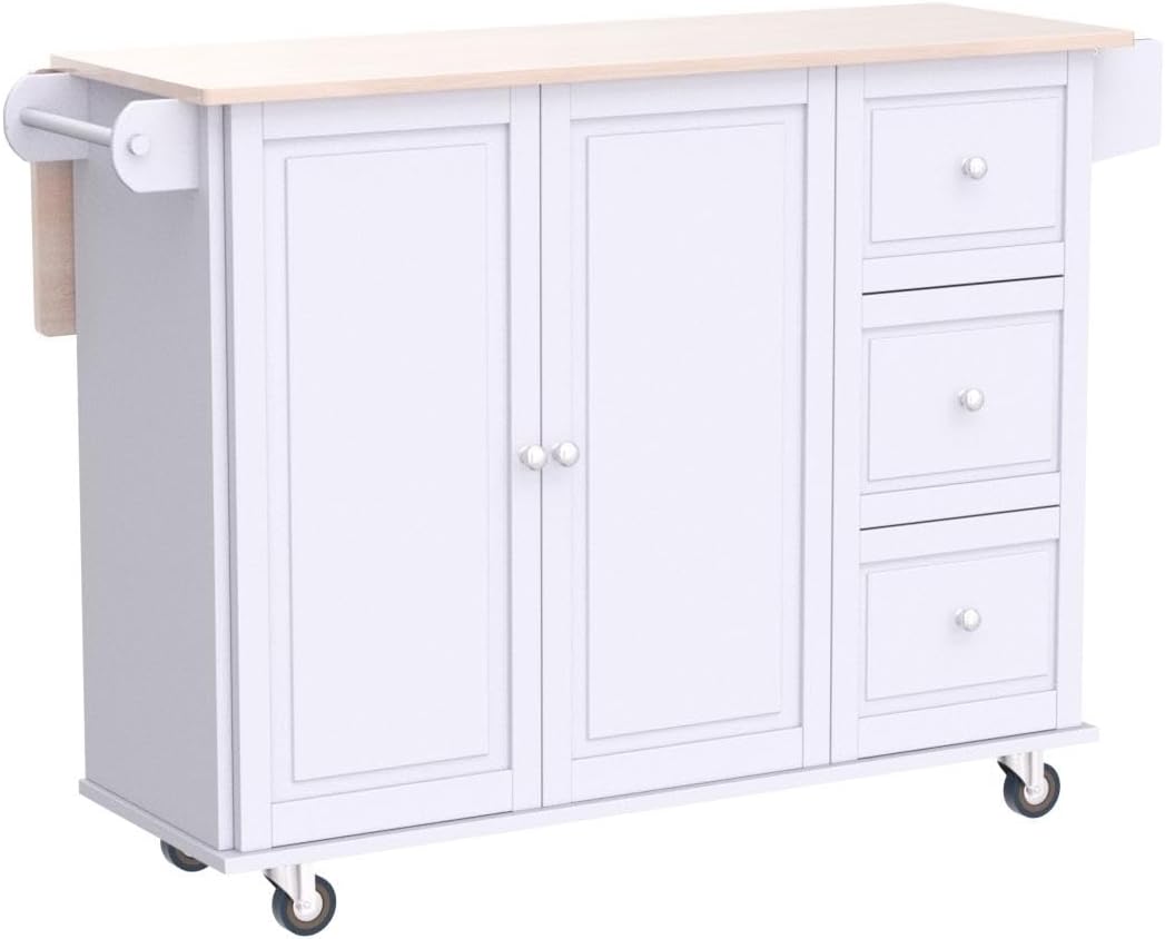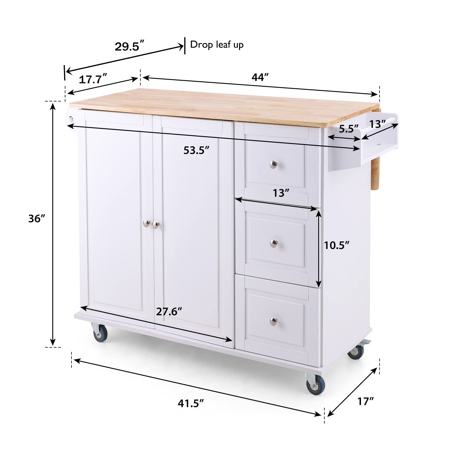 - Kitchen Cart with Storage - This wallet-sparing and space saving island features 3 easy-glide drawers, towel holder and spice rack, concealed storage cabinet with double door design, providing ample storage for all kinds of kitchen utensils and supplies. Dimension:53.5‘’W (Tabletop 44'') x 17.7’’D (with drop leaf 29.5’’) x 36.5’’H