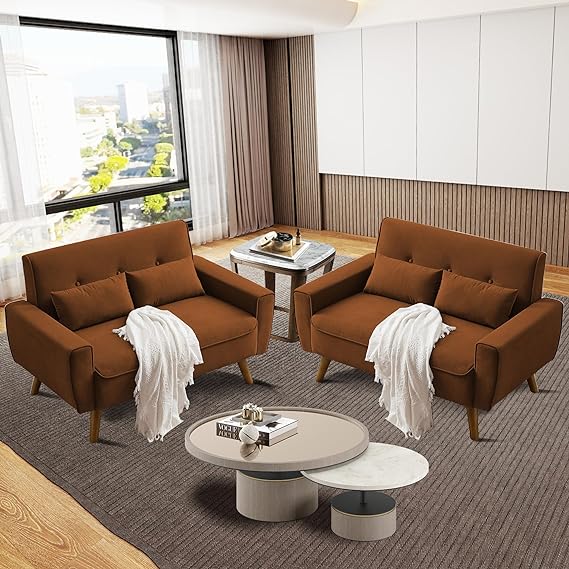 - Our small couches will become your favorite leisure place. High-resilient sponge cushions and breathable linen fabrics create soft seating experience.Wide track armrests where you can relax your arms,extra throw pillows offer softer support to your back.