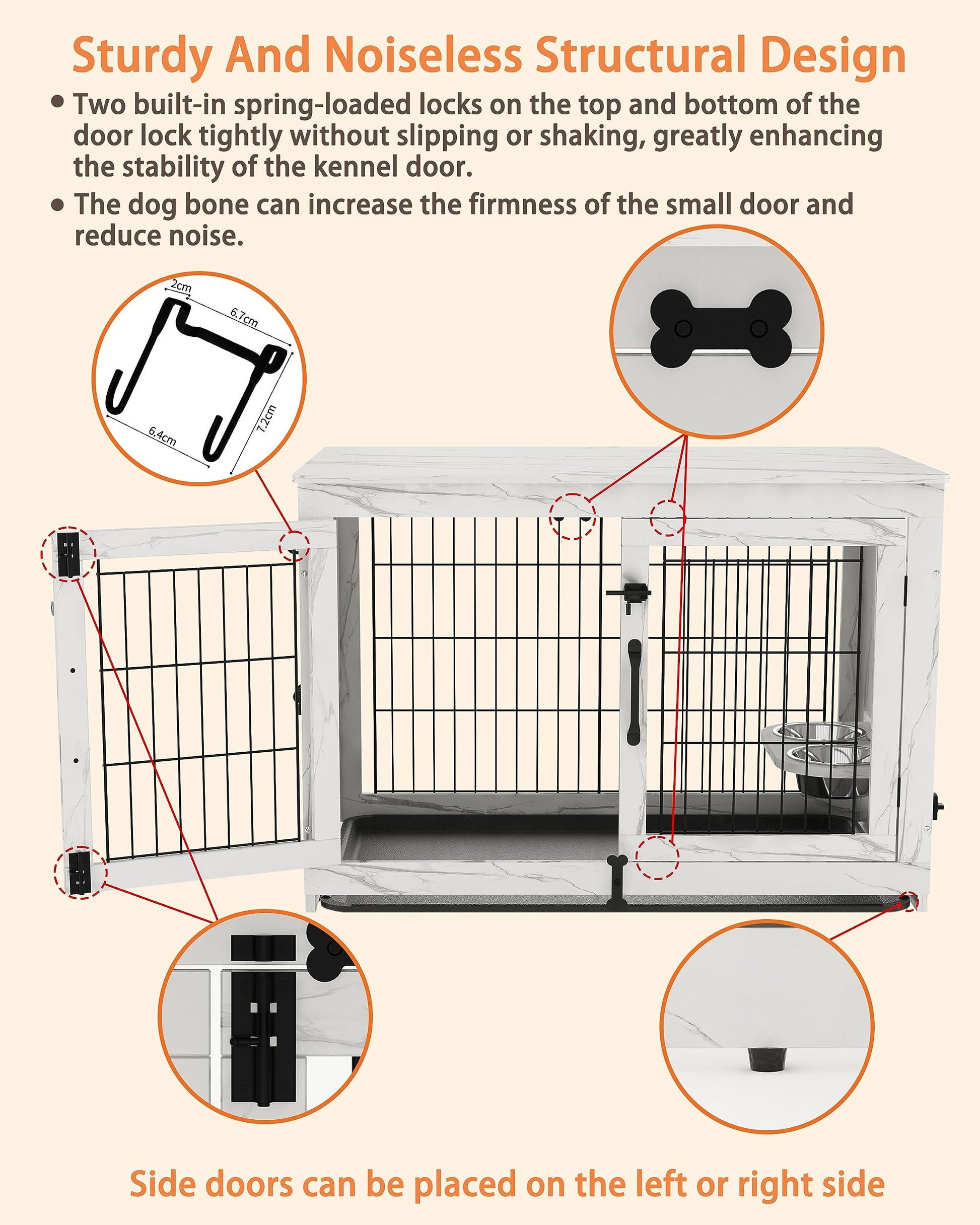 - Upgraded Sturdy Door Lock : With the design of the front bolt lock and the built-in spring lock, it fits snugly onto the door frame, minimizing noise as your dog moves around inside. Even in the face of a smart dog, The door lock will still hold its position! The side door can be placed on the left or right.