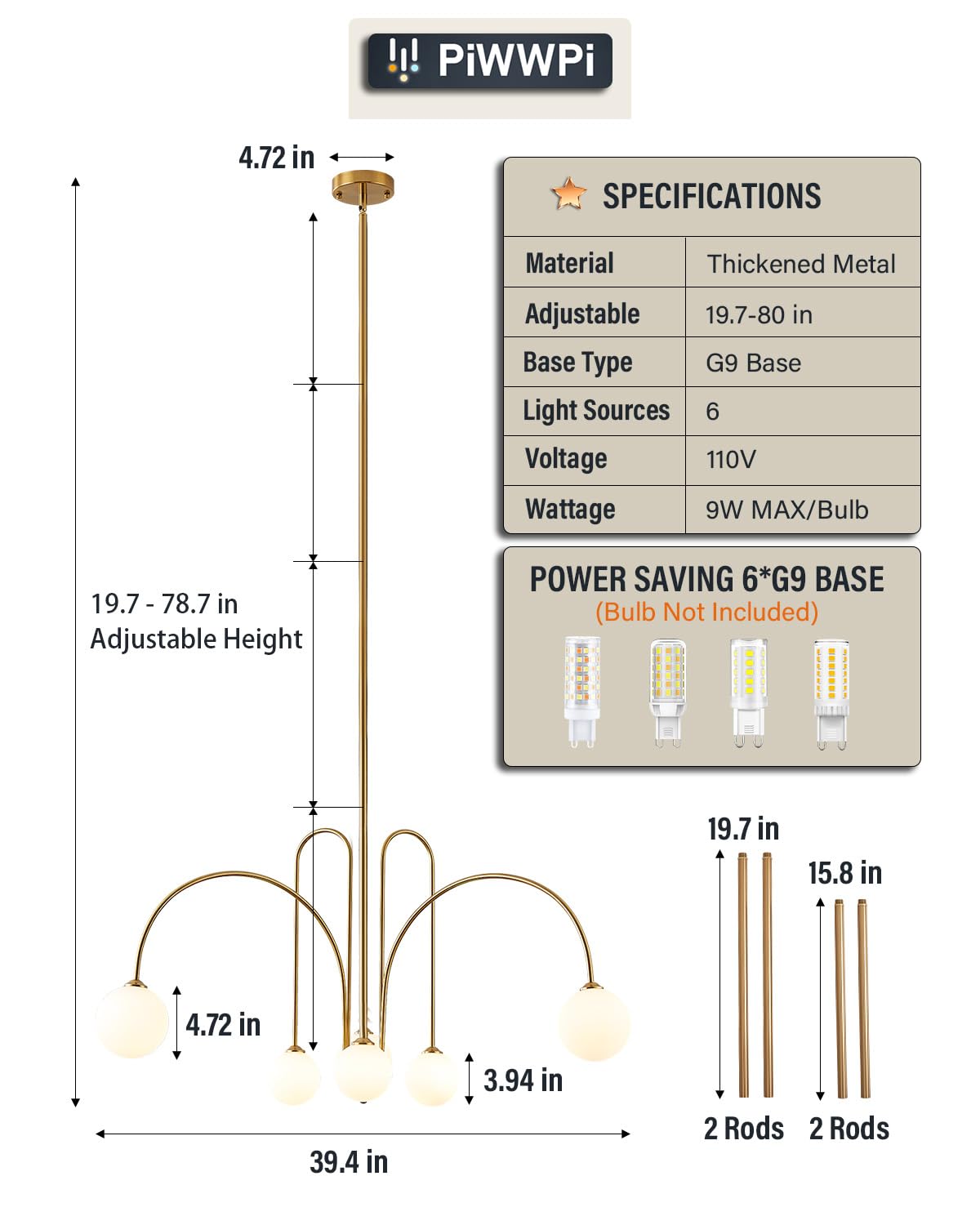 - G9 Bulb & Dimmable:Requires 6 G9 bulbs (MAX 9W, Not Included). 3-color temperature G9 LED bulbs are recommended to create different atmospheres: Warm (2700K), Neutral (4000K), White (6000K). The elegant globe chandelier includes dimmable feature, but only when you use dimmer switch and dimmable light bulbs together (Not Included).