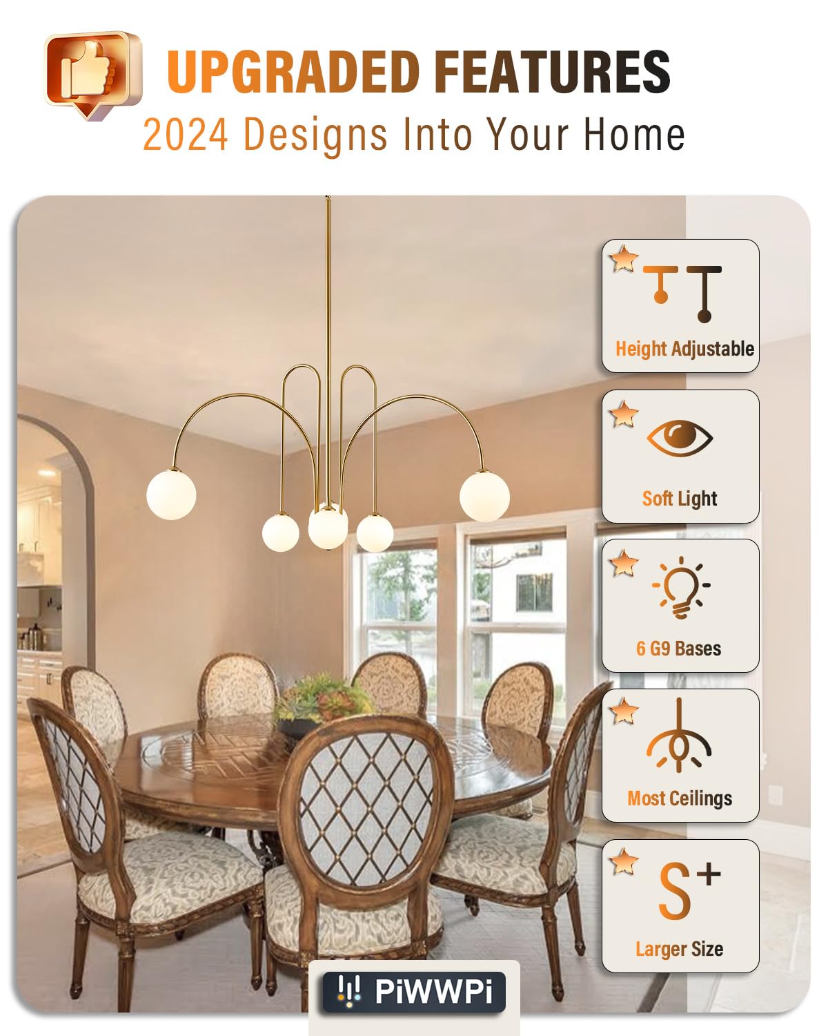 - Upgraded Modern Globe Chandelier:This mid century chandelier is designed with 6 white glass globe and a brass gold body, creates a unique look with a linear shape. This minimalist look bubble chandelier from PiWWPi designers creates a premium and elegant style in your home, whether the lights are on or off.