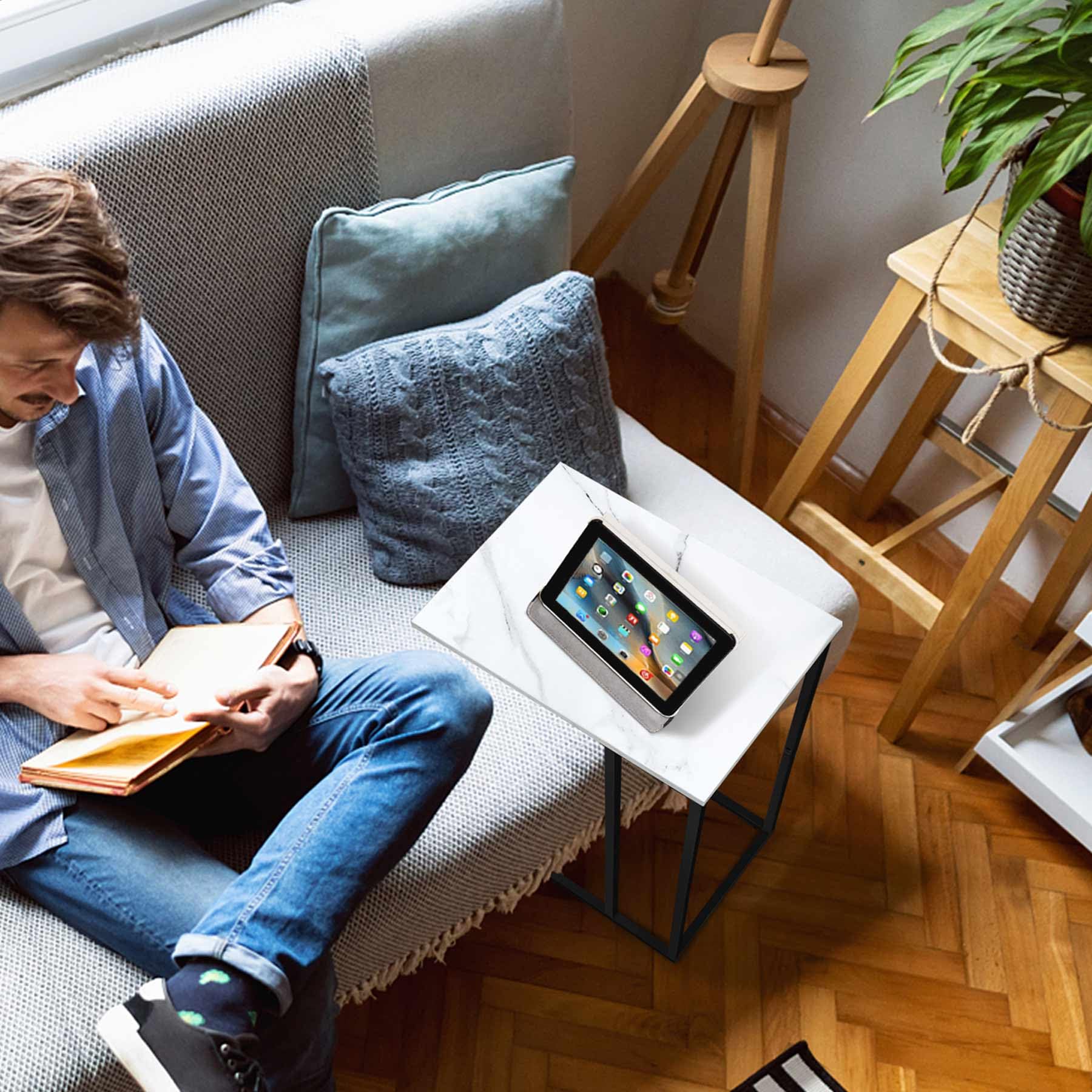 - Minimalist Modern Design This slim couch side table tabletop is made of rectangle MDF board and finished with a beautiful white faux marble. The desktop is waterproof and very easy to clean. The beauty of the skinny sofa end table collection is its simplicity. Minimal lines and a contemporary aesthetic make all the pieces in the series easy to fit into just about any style of decor.