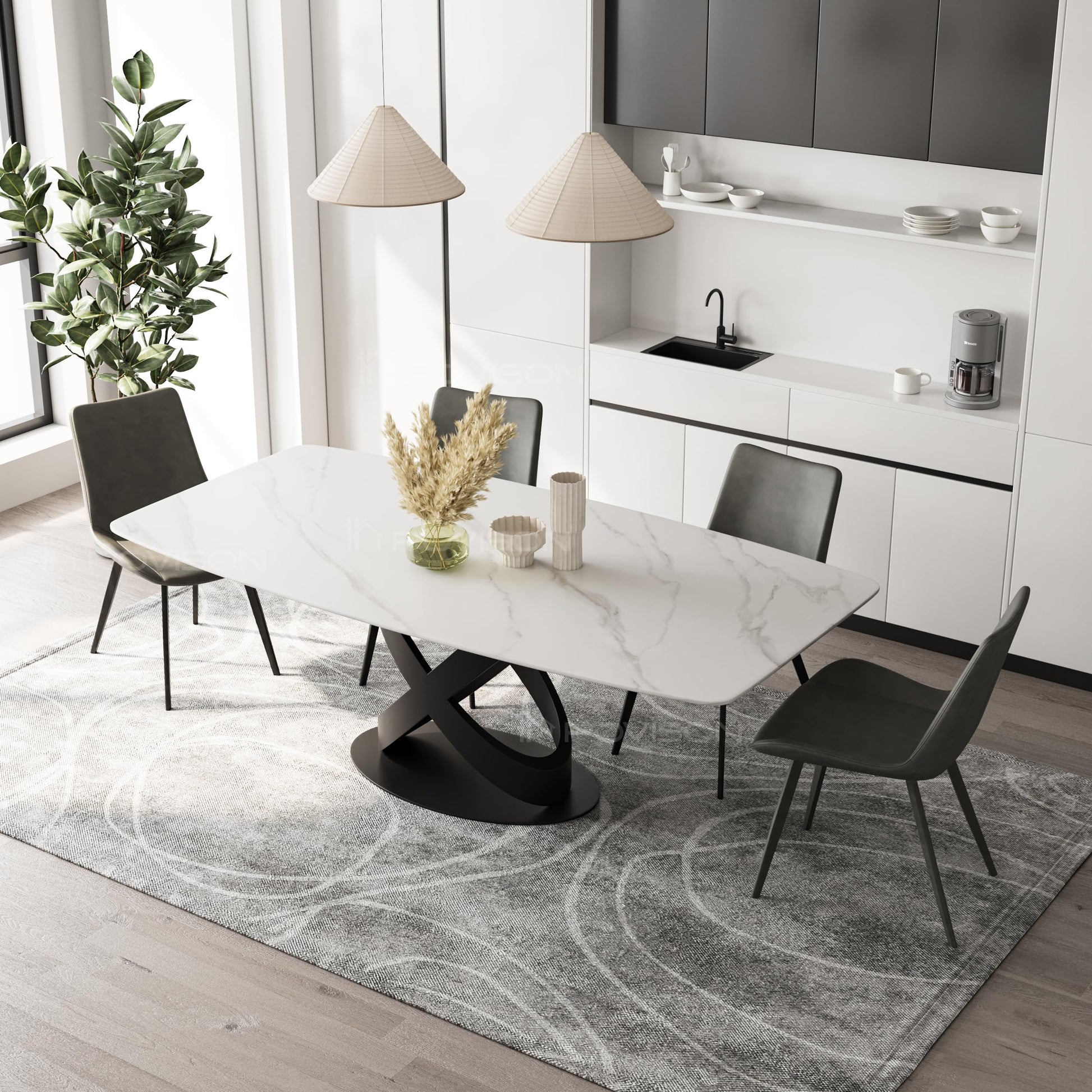 - The modern kitchen table top is crafted from a sintered stone material, it can offers better exceptional resistance to scratches and heat than faux marble dining table top. This makes it an ideal choice for meal use, as well as for hosting party. The texture of the sintered stone top adds a touch of sophistication to the table dining.