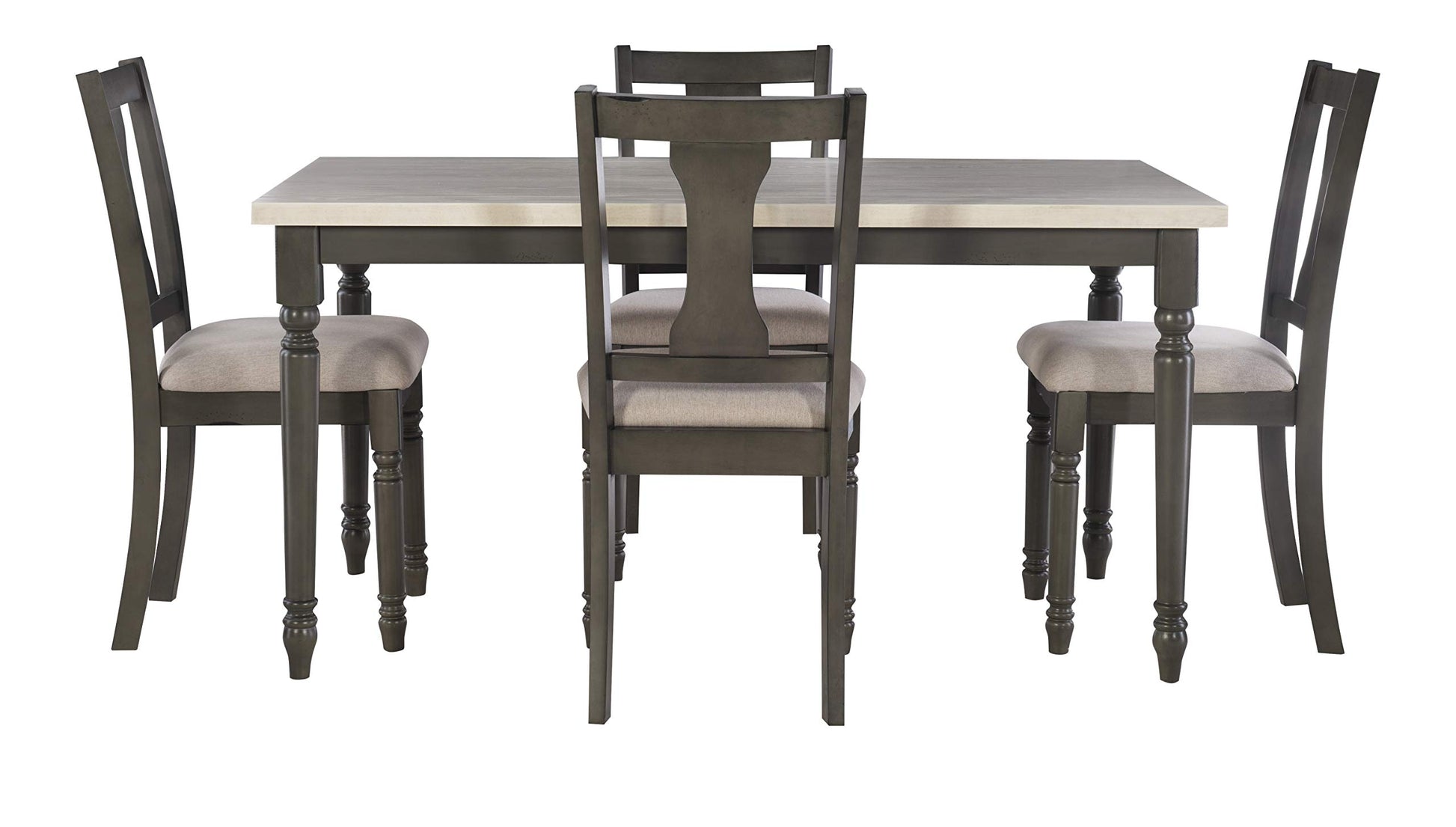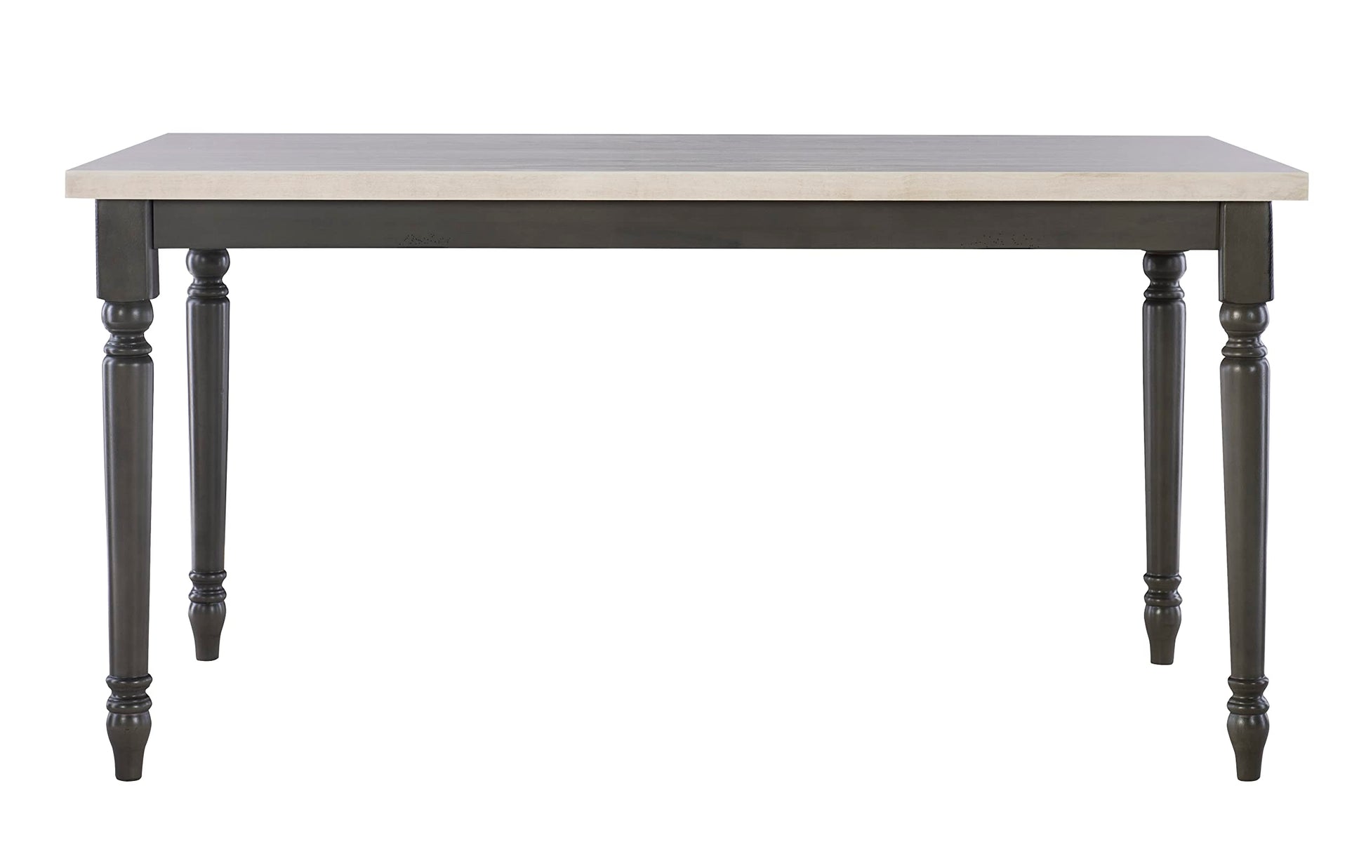 - Glazed smokey white table top, with a dark grey base and chairs that adds character to this two-tone farmhouse designed five piece dining set.