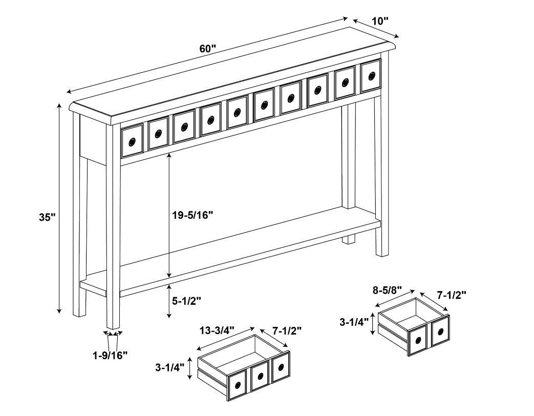 - Features a lower shelf for storage.Shelf Dimensions: 58.5 W x 9 L inches