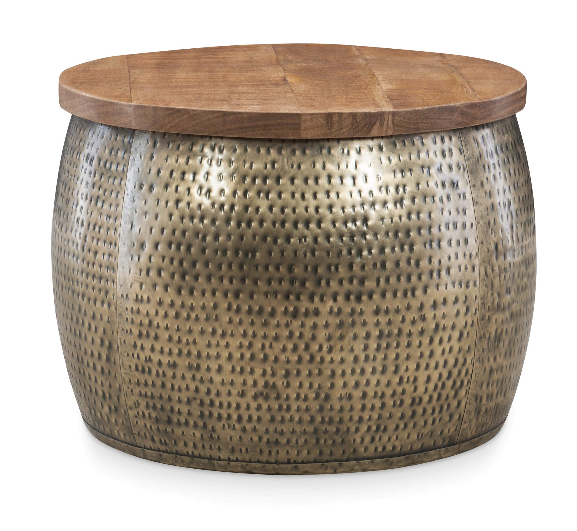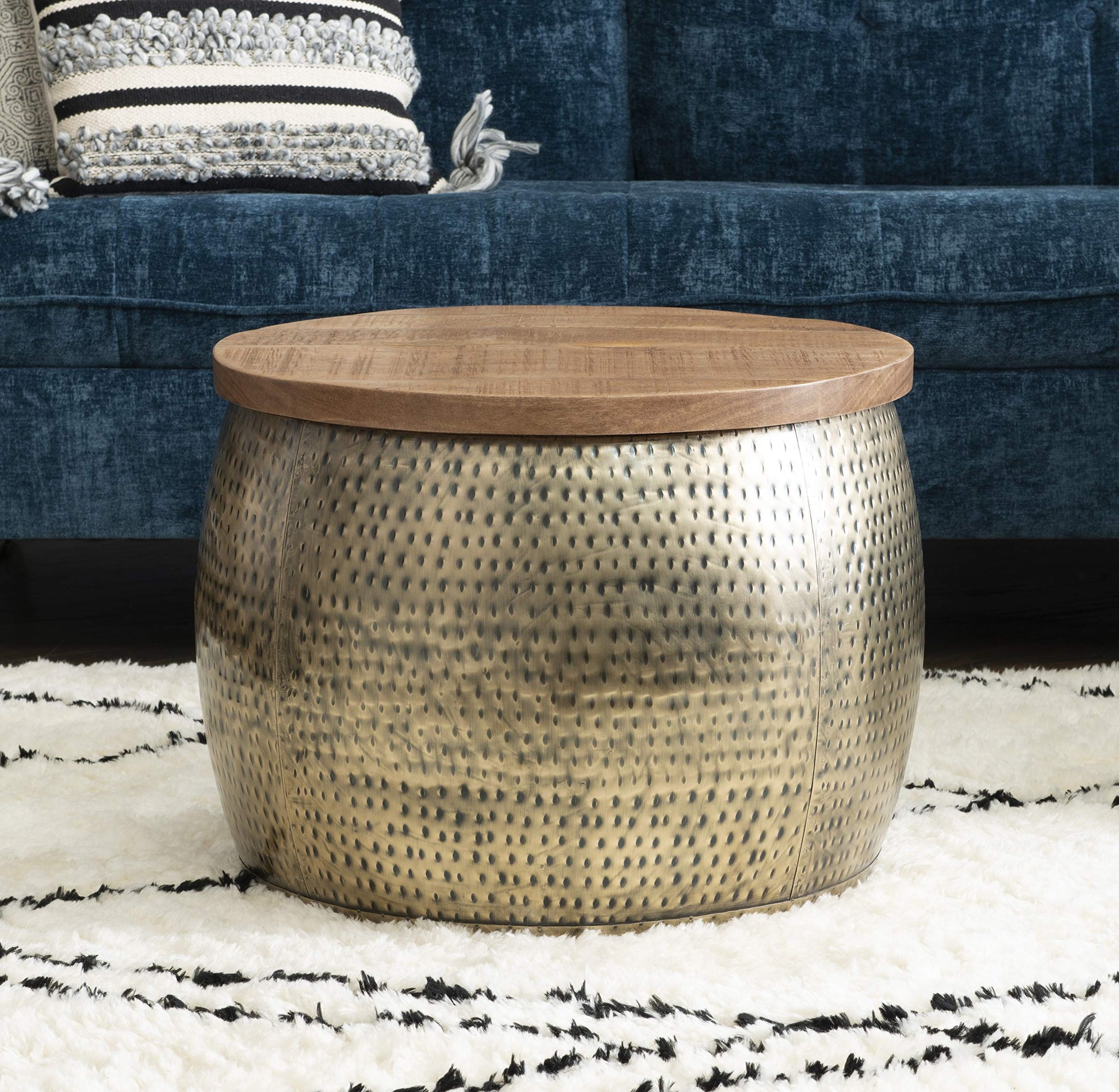 Hammered Gold Drum with Natural Wood Lift Top for Storage Janice Table