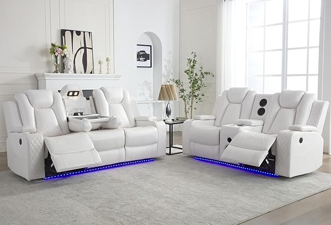 - Attractive LED strips & stereo sound: The striking LED floor strip on the bottom of the sofa couch and loveseat sets illuminates your living space and brings a home theater atmosphere to your living area. It can be easily controlled on or off through buttons. Pair speakers via Bluetooth to play the music in perfect sync, and create an immersive stereo sound experience. Perfect for gaming, music, and movie playback. The recliner sofa set helps you relax while getting into the mood for drama and action. (Tip: Speaker is Not Compatible with TV)
