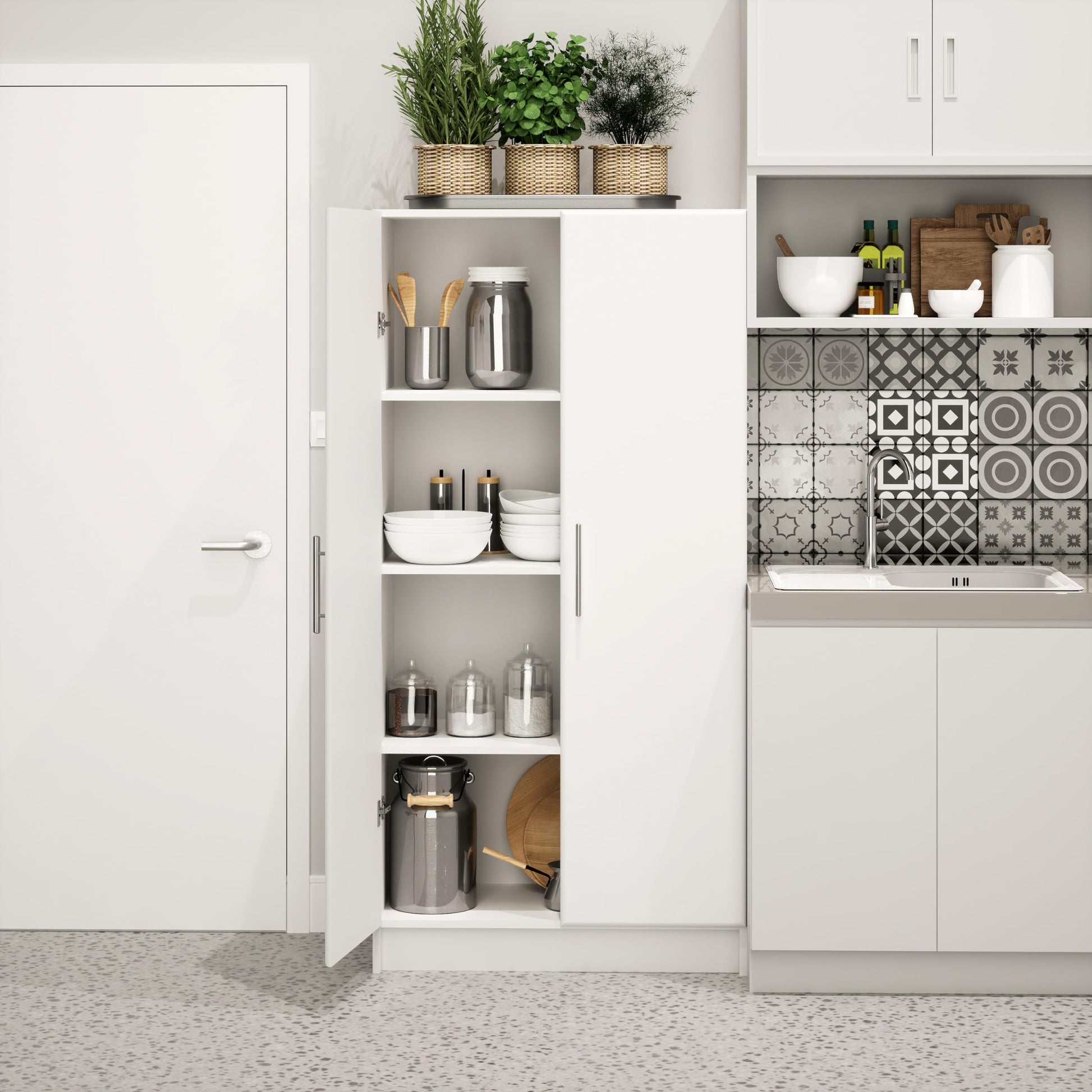 Details: Experience unmatched storage and organization with the Elite Two-Door Freestanding Cabinet from Prepac. This versatile unit, measuring 16" D x 32" W x 65" H, boasts of an internal storage size of 15.75" D x 30.25" W x 59.5" H. This makes it perfect for storage shelves, garage shelving, or as bathroom cabinet providing you with 34% more space compared to standard storage cabinets. It's your ultimate pantry and utility closet rolled into one. The cabinet skewers towards sophistication with its crisp white laminate finish and satin nickel-finished metal handles. The doors open to reveal two adjustable shelves and one fixed shelf, the adjustable 6-way European style hinges enabling seamless access to your belongings. You can adjust the shelving units and storage the way you want, satisfying your organization needs conveniently, whether as a bookshelf or any other storage shelf. The tall unfussy design of this cabinet makes it ideal for garage cabinets, and the compact design suits standalone storage needs perfectly or can be paired with other Elite storage cabinets. As a bathroom cabinet or garage organization cabinet, its usage is diversified. Moreover, this cabinet can also serve as a functional pantry cabinet in your kitchen or a handy organizer in your laundry room. This garage cabinet is manufactured in North America from durable and non-toxic CARB-2 compliant laminated composite woods ensuring a high-quality product that is safe for use. It ships flat-packed and ready to assemble, complete with an instructional booklet making the setup easy. Regardless of your storage needs and organizational challenges, Prepac's Elite Two-Door Freestanding Cabinet offers a robust, stylish, and versatile solution.