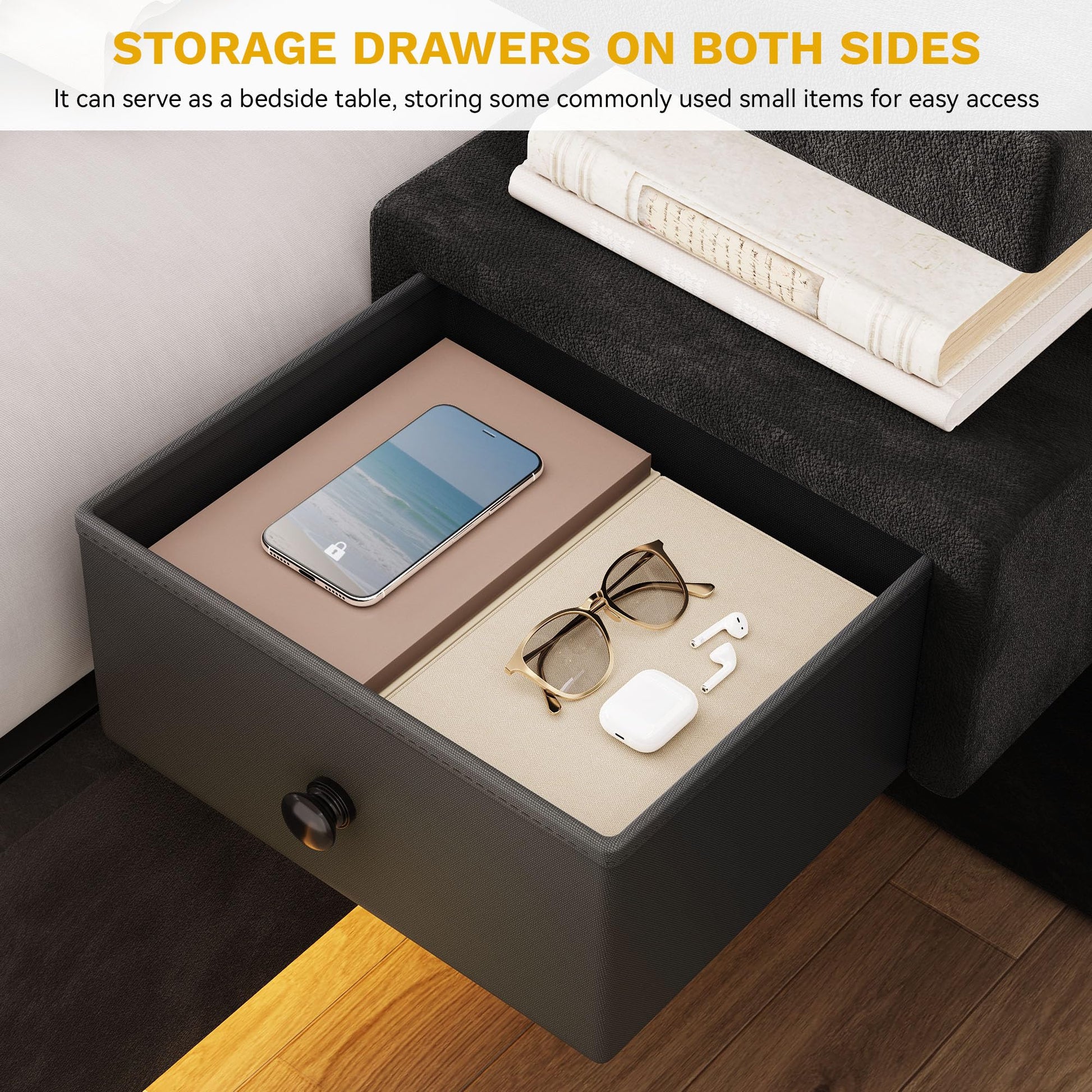 - Storage drawers and attached nightstands for maximum functionality