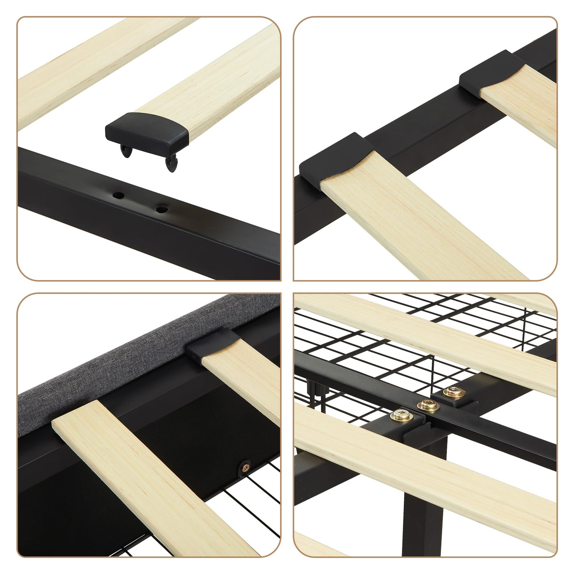 - The mattress slats of our bed frame with headboard are crafted from sturdy hardwood to support the mattress and minimize sagging, catering to both inner-spring and memory foam mattresses. Additionally, non-slip strips pressed onto the slats and a unique buckle structure design help stabilize the queen platform bed frame, preventing noise and creating a tranquil, comfortable sleeping environment.