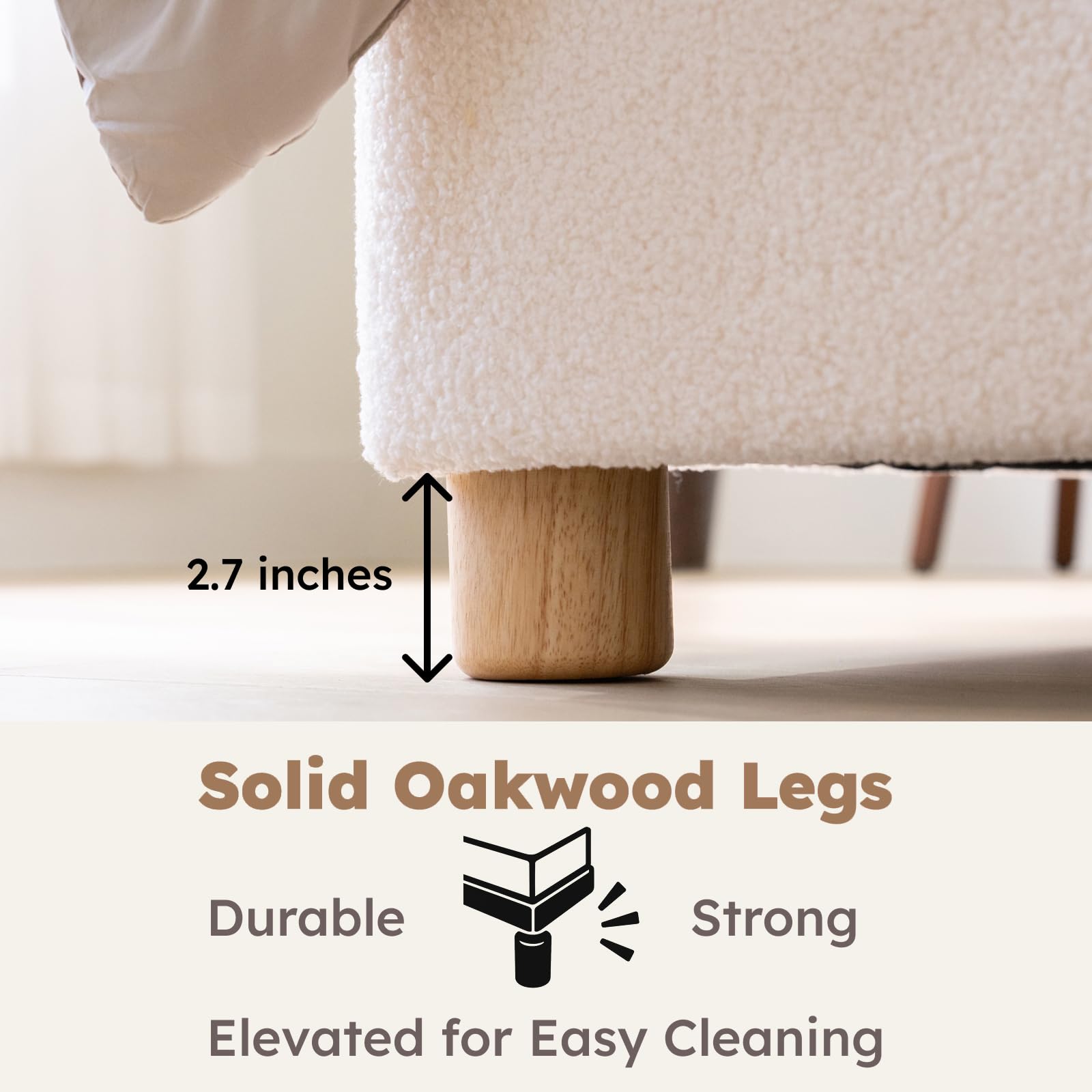| Material | Boucle Fabric, Solid Wood |