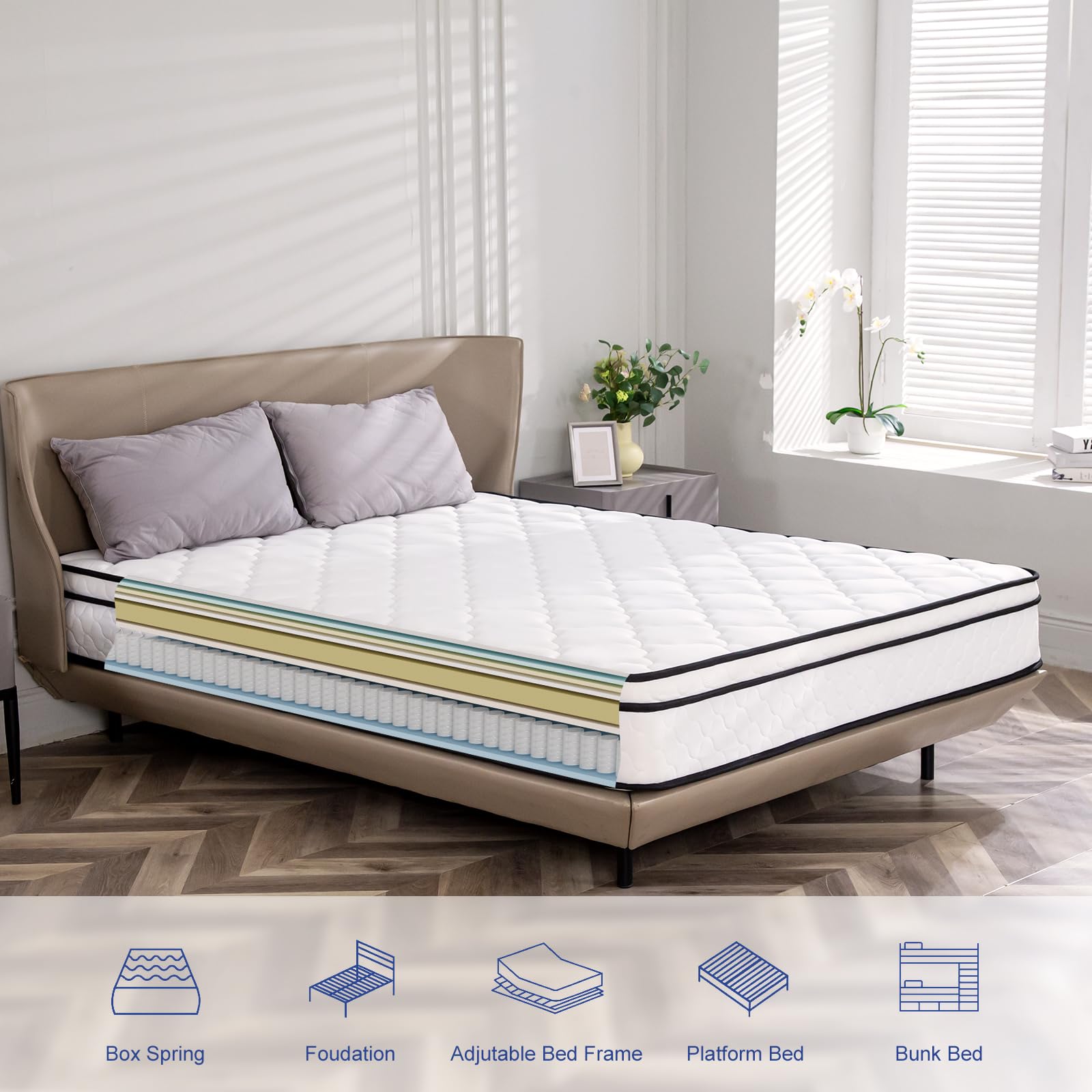 - 10-inch hybrid queen mattress is designed with multiple layers foams and Bonnell coil with excellent rebound help to distribute your weight evenly, and relieve pressure points of total body while increasing enough softness and comfort.
