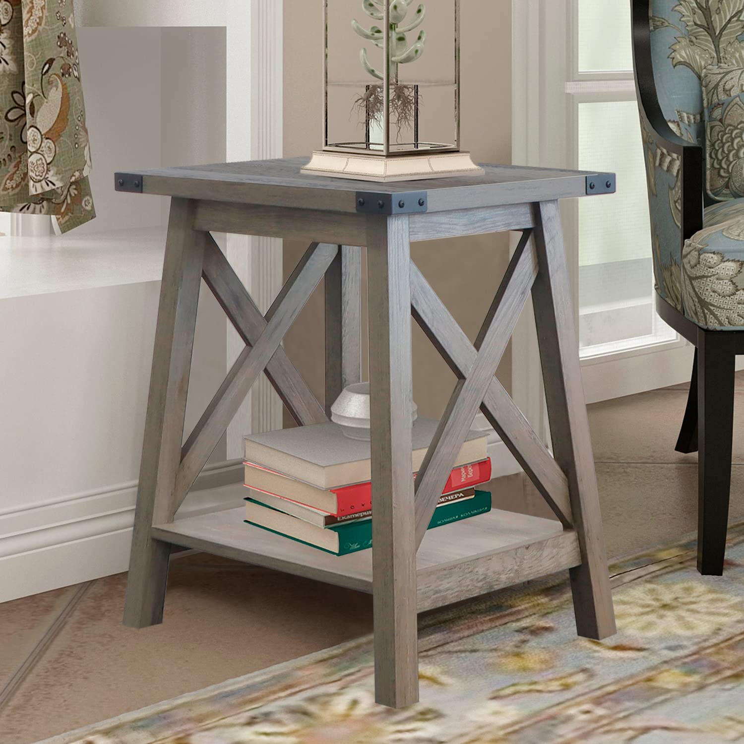 - Narrow side table featuring farmhouse accent X-frame, suitable for living room or bedside at your choice. Easy assembly.