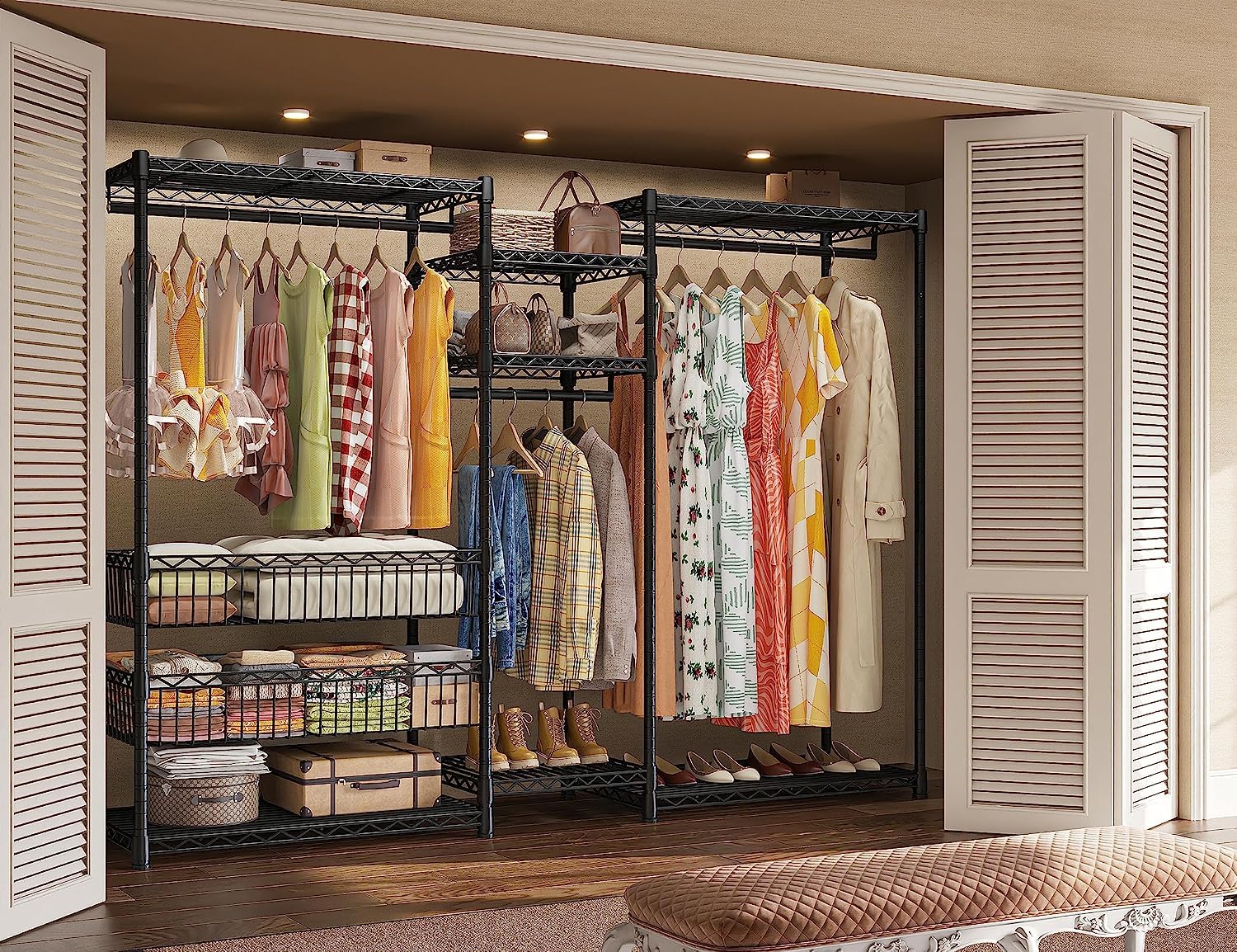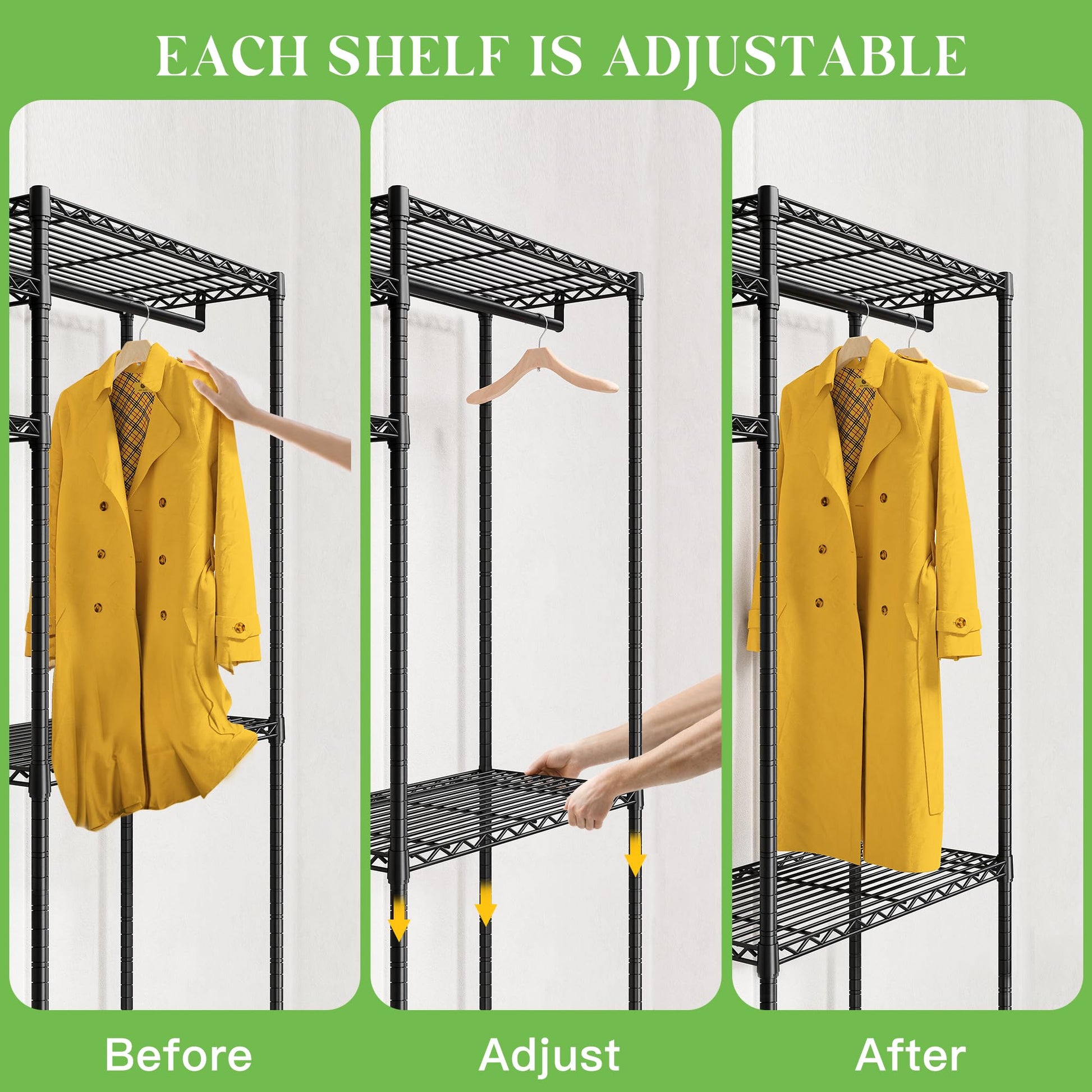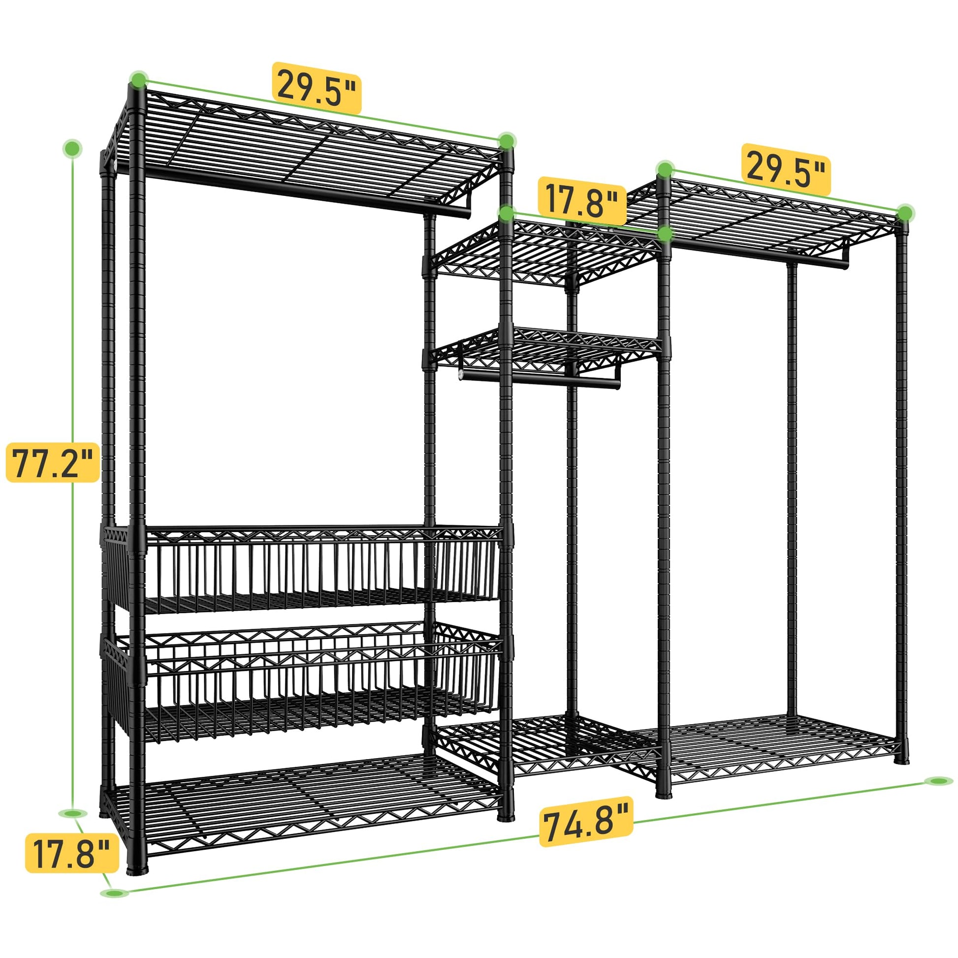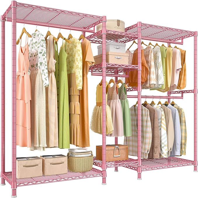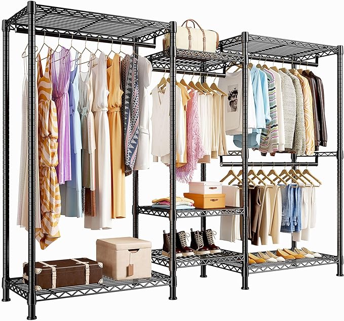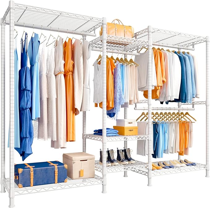 - Adjustable & Detachable Clothing Rack 7 shelves and 3 hanging rods of the freestanding closet wardrobe are all easily adjustable and detachable by the slip-sleeve locking system, according to the objects that you need to store. Besides, you can remove the shelf and baskets if you do not need them. Perfect large garment rack meets all your needs.