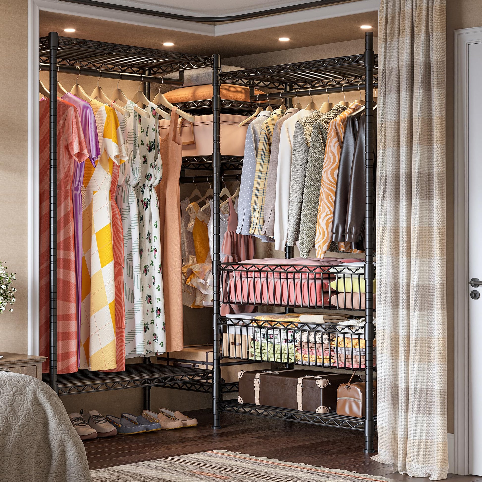 - Configure the Closet as You LikeThis clothing rack for hanging clothes has 3 main combination methods for varied size rooms. “L” shape & Horizontal shape & 2 separate clothing racks. You can put the portable closet rack almost anywhere, like a corner, apartment, bedroom, clothing store, walk-in closet, cloakroom, laundry room, small closet, etc.
