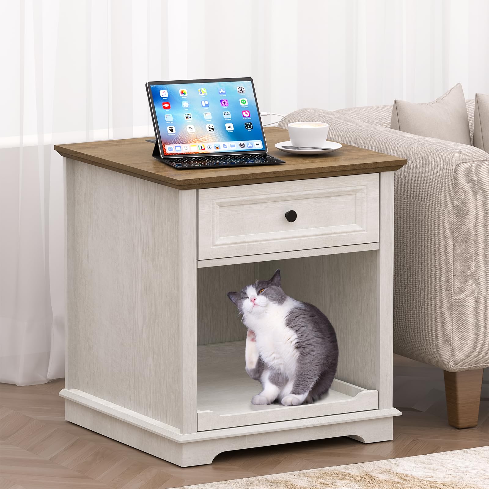 REDAYFUR 24" Large End Table with Charging Station, Sofa Side Table with Drawers, Square Storage Table with 2 Open Mind Drawers & Adjustable Storage Shelf for Living Room,Study Room,Antique White