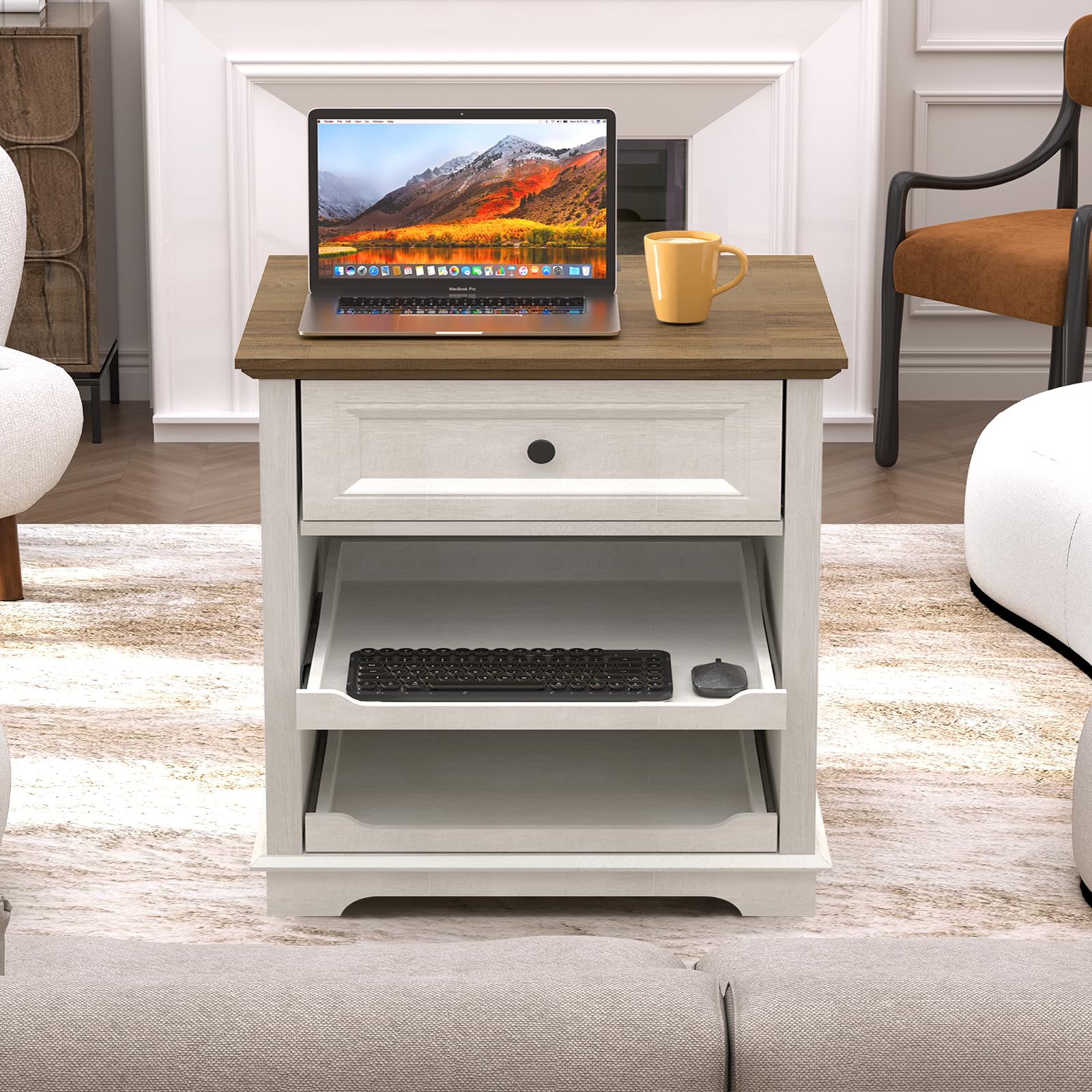Details: REDAYFUR 24-inch Extra Wide 27-inch Extra High End Table with 18w Fast Charger. Two three-hole charging ports, two USB-A ports and one fast charging USB-C port can meet various charging needs. Convenient for entertainment and leisure use. One closed drawer and two open keyboard cabinets, compatible with storage and display functions. Easy-to-install slides for effortless opening and closing. Vintage and elegant appearance, selected wood grain is clearly visible, unique. Easy to install with illustrated instructions. Enjoy 24-hour online counseling service and up to 2-year warranty.